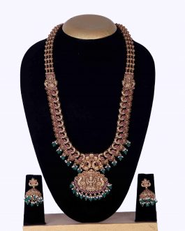 - Traditional Temple Jewellery Antique Gold-Plated Lakshmi Pendant Necklace Set with Jhumkas Product Description:Add divine charm to your ethnic look with this exquisite temple jewellery necklace set, handcrafted with intricate Lakshmi motifs. Made from durable brass and finished with antique gold plating, the set includes a beautifully detailed pendant necklace and matching jhumka earrings. Ideal for festive occasions, weddings, and traditional…
