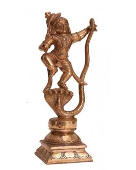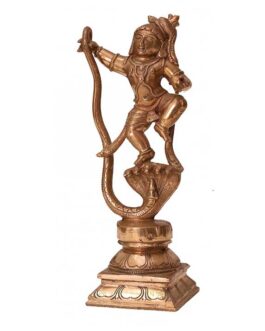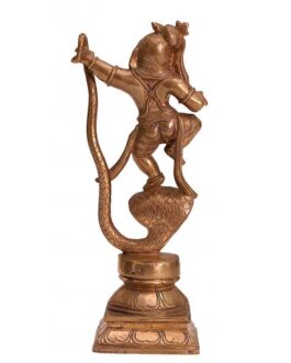 The intricate details of the idol, from the serene expression on Krishna’s face to the finely adorned ornaments and flowing drapery, reflect exceptional craftsmanship. The rich bronze finish gives it an antique charm, making it a perfect addition to your home temple, living space, or art collection.