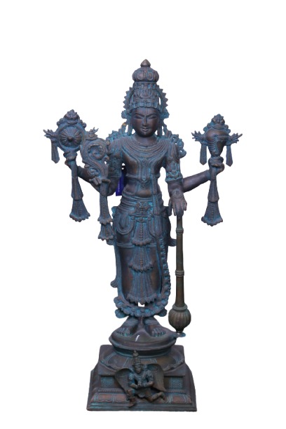 Elevate your space with this stunning 16-inch Bronze Krishnan Statue, a masterpiece of craftsmanship and devotion. Carefully sculpted to capture the divine charm of Lord Krishna, this statue exudes grace and spirituality. The statue is made from high-quality bronze, offering a rich antique finish that enhances its timeless appeal.