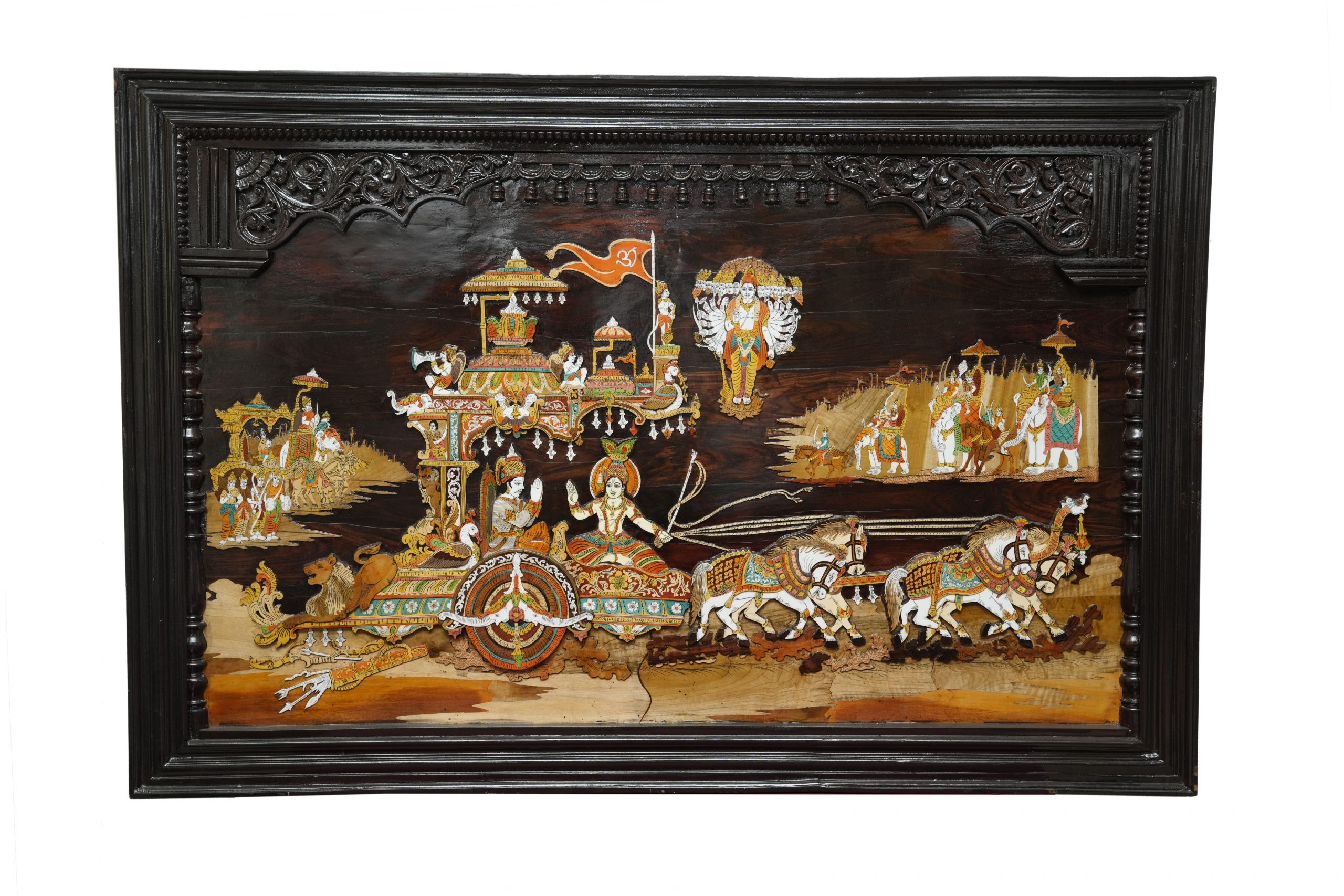 Immerse yourself in the divine wisdom of the Bhagavad Gita with this exquisitely carved 48×72-Inch Rosewood Geetha Upadesam Panel.