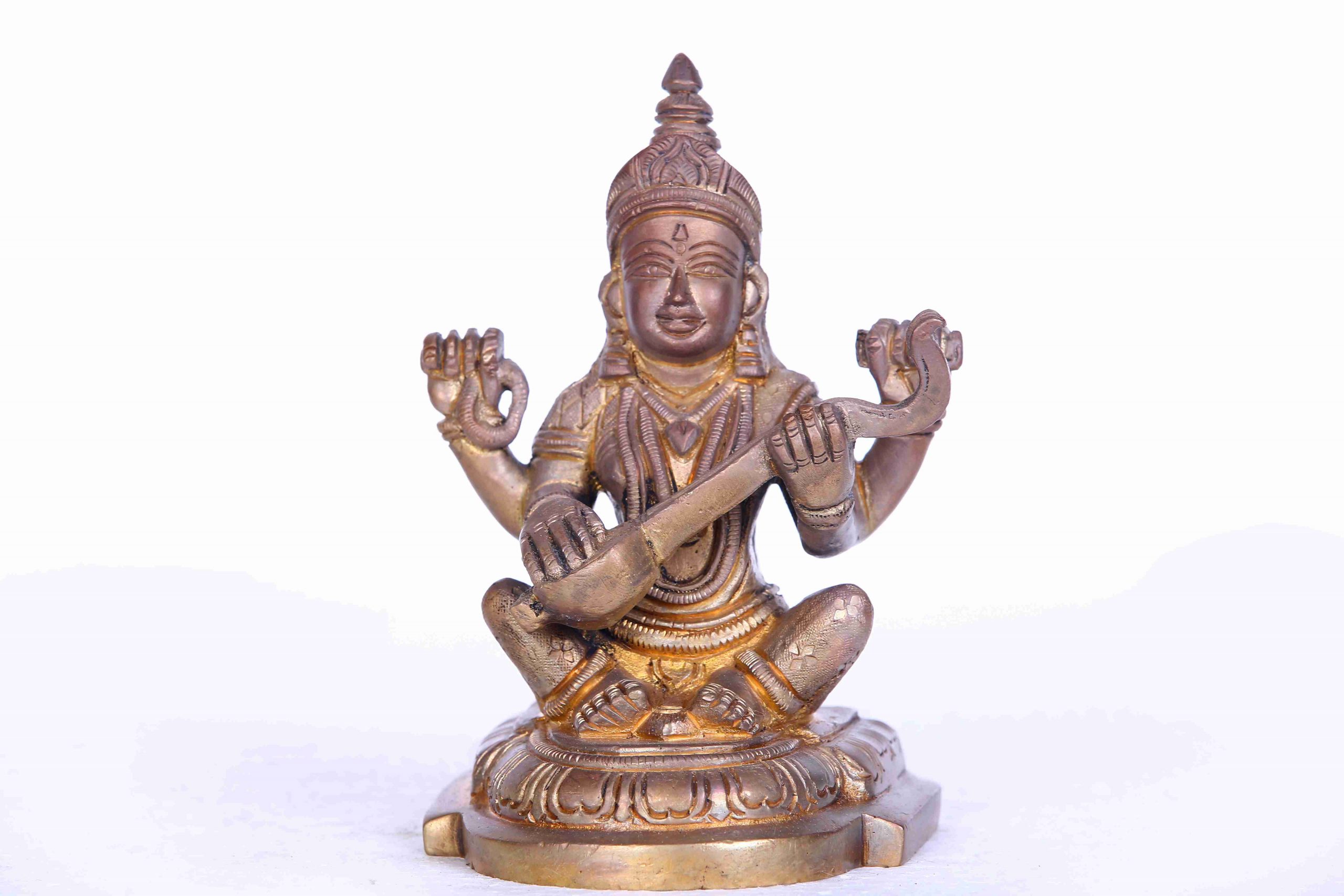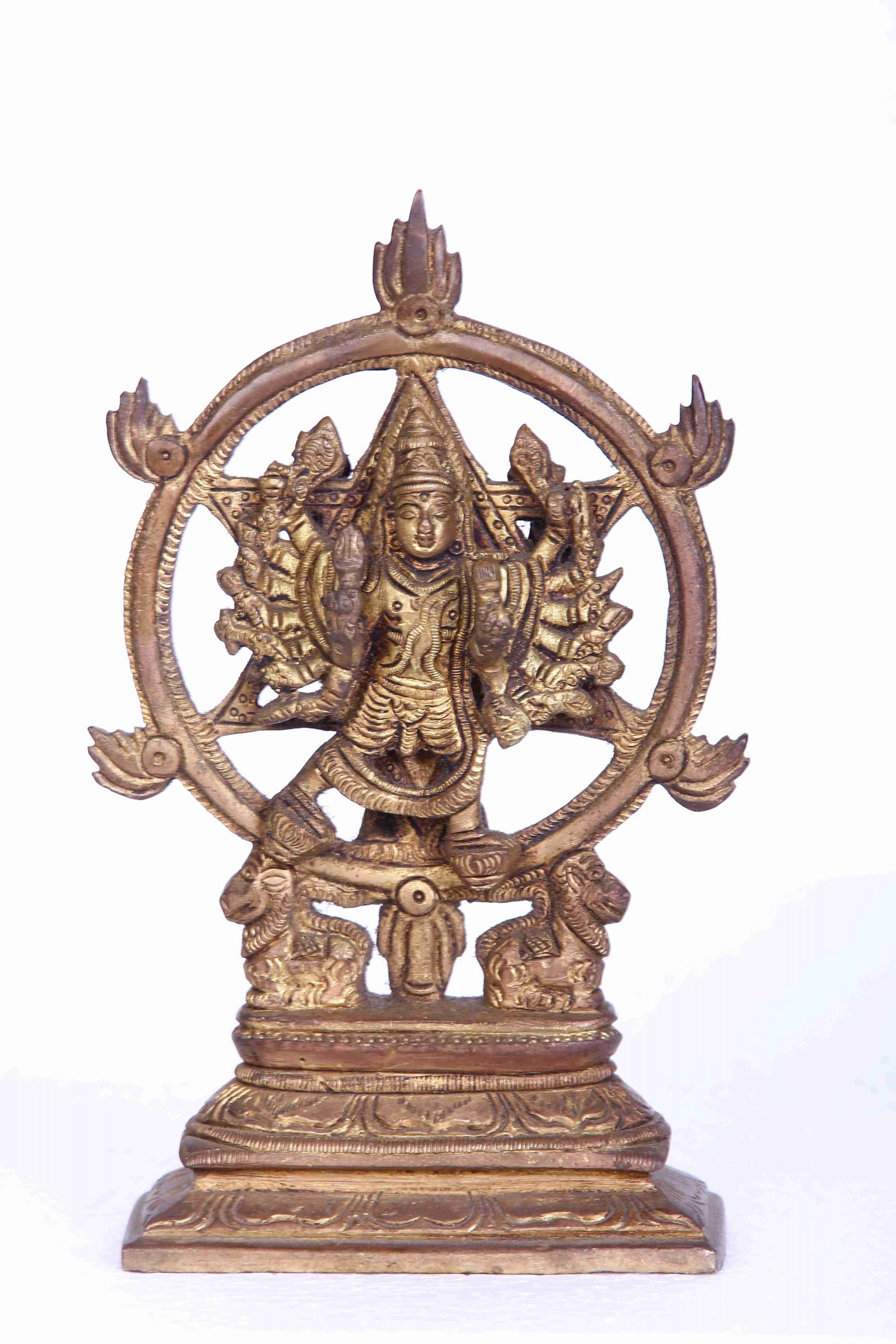 Meticulously handcrafted by skilled artisans of Tamil Nadu, this idol is made from high-quality brass, featuring intricate detailing on the chakra, sacred symbols, and divine posture. The radiant golden finish enhances its spiritual aura, making it an ideal addition to your pooja room, temple, or as a centerpiece in your spiritual décor collection.