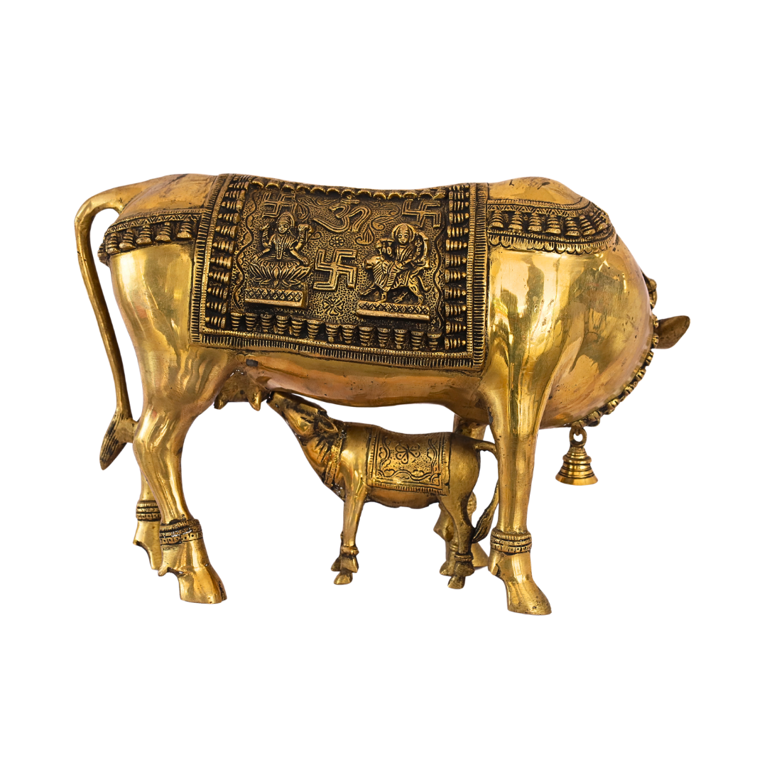 - Material: Made from durable brass, known for its enduring qualities and radiant golden finish. Brass is a traditional material used in Indian art for its beauty and longevity. The statue’s detailed craftsmanship reflects the sacred bond between the cow and calf, two animals held in reverence for their role in spiritual and agricultural prosperity.