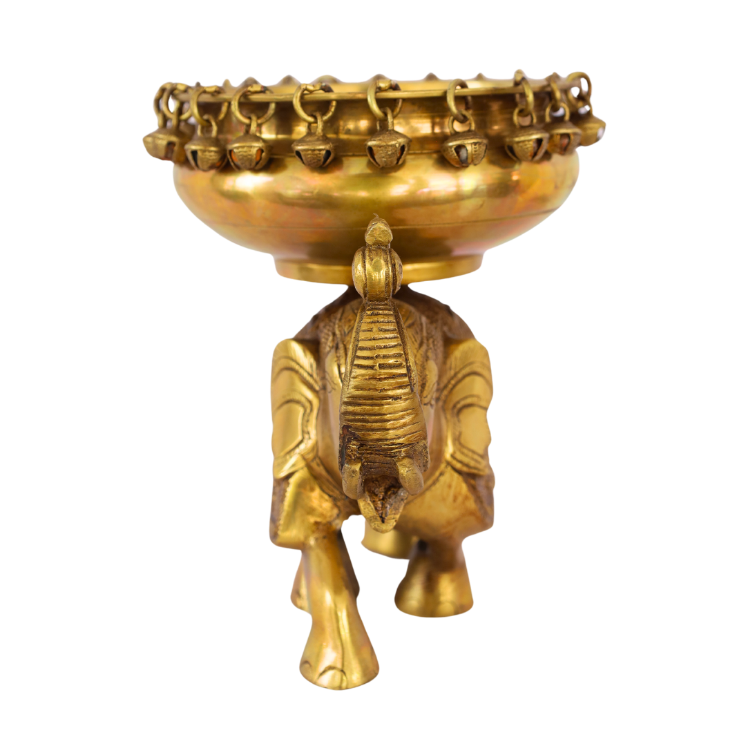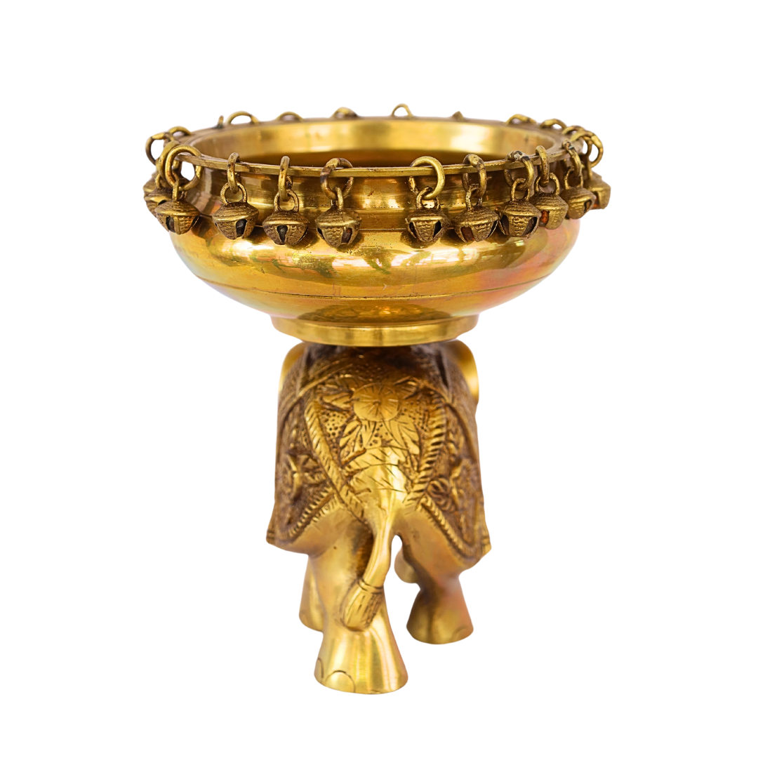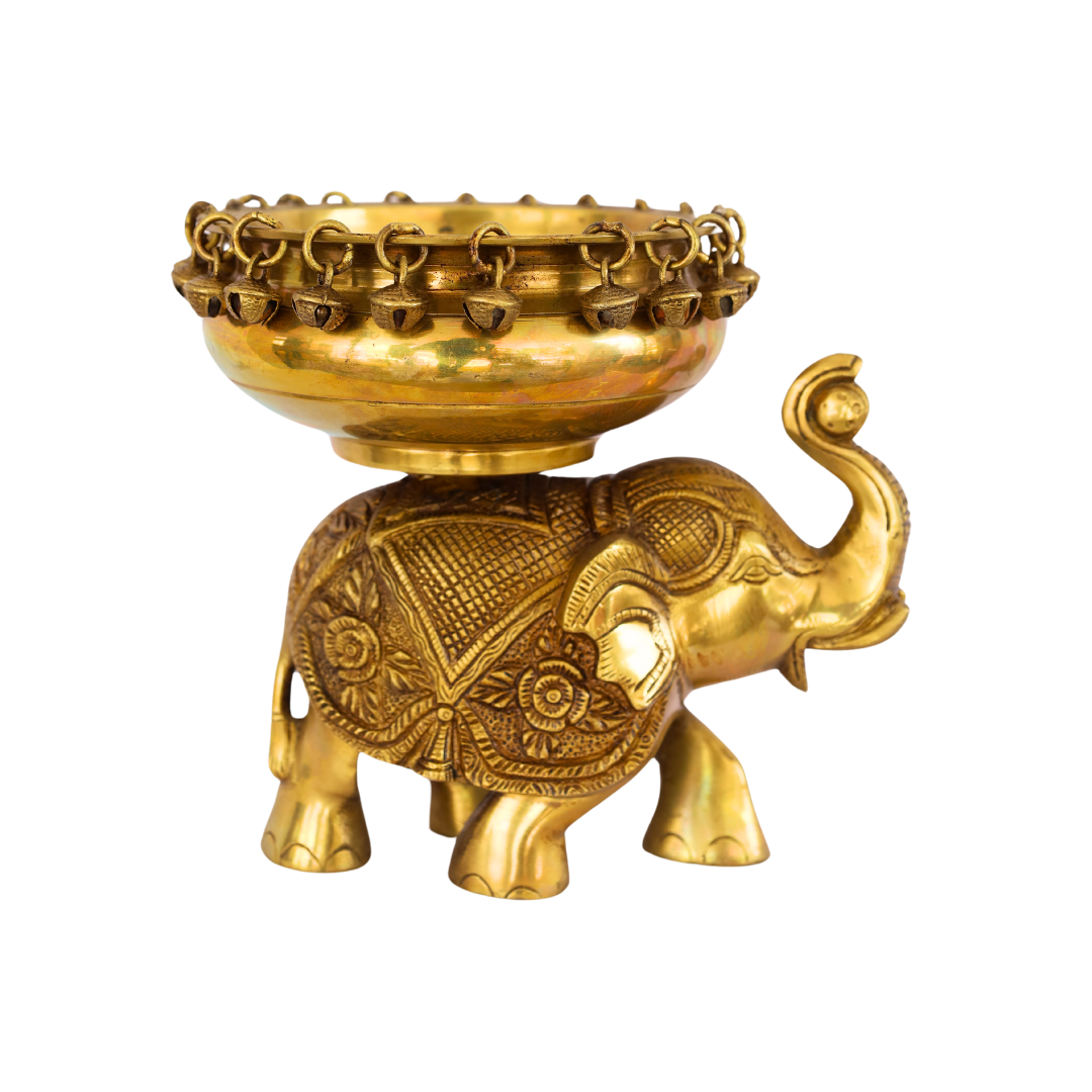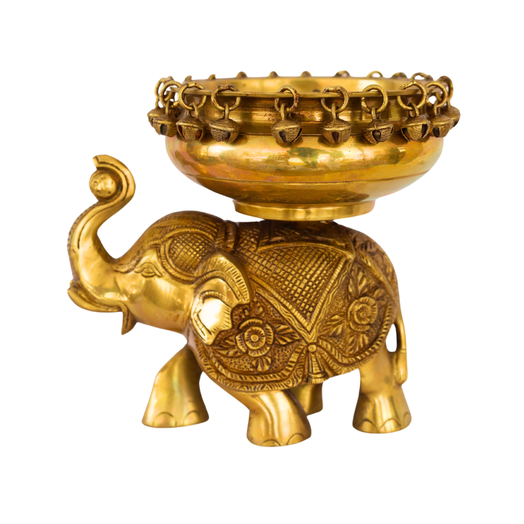 - Elegant Brass Elephant Uruli: This beautiful Brass Elephant Uruli (8 Inch) combines the symbolic significance of elephants with the utility of a traditional uruli (decorative bowl). The elephant motifs carved on the side of the bowl symbolize strength, wisdom, and prosperity. Elephants are considered auspicious in Hindu culture, representing good fortune, power, and spiritual protection. The brass finish with a subtle antique patina gives the piece a classic, timeless look that enhances any space.