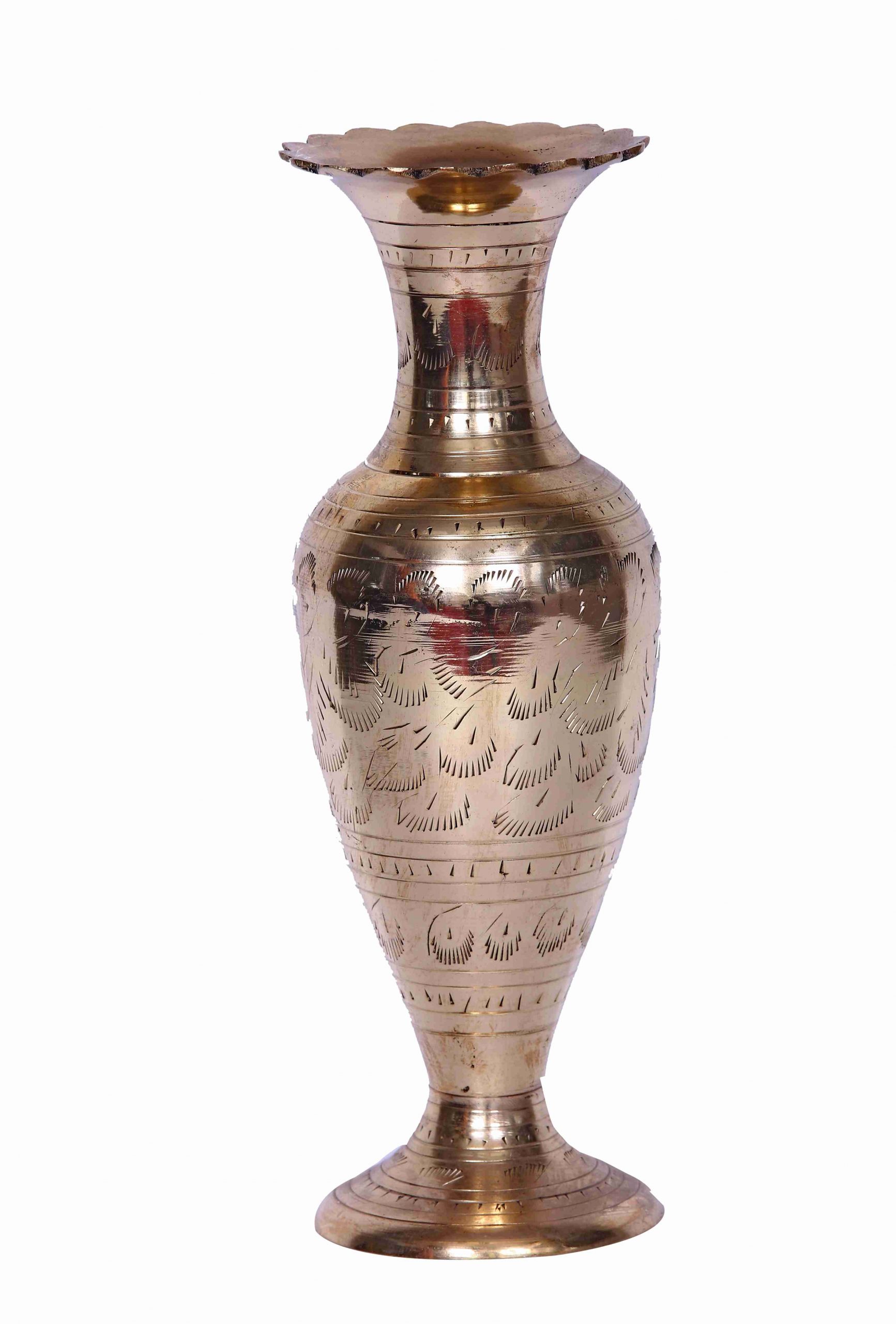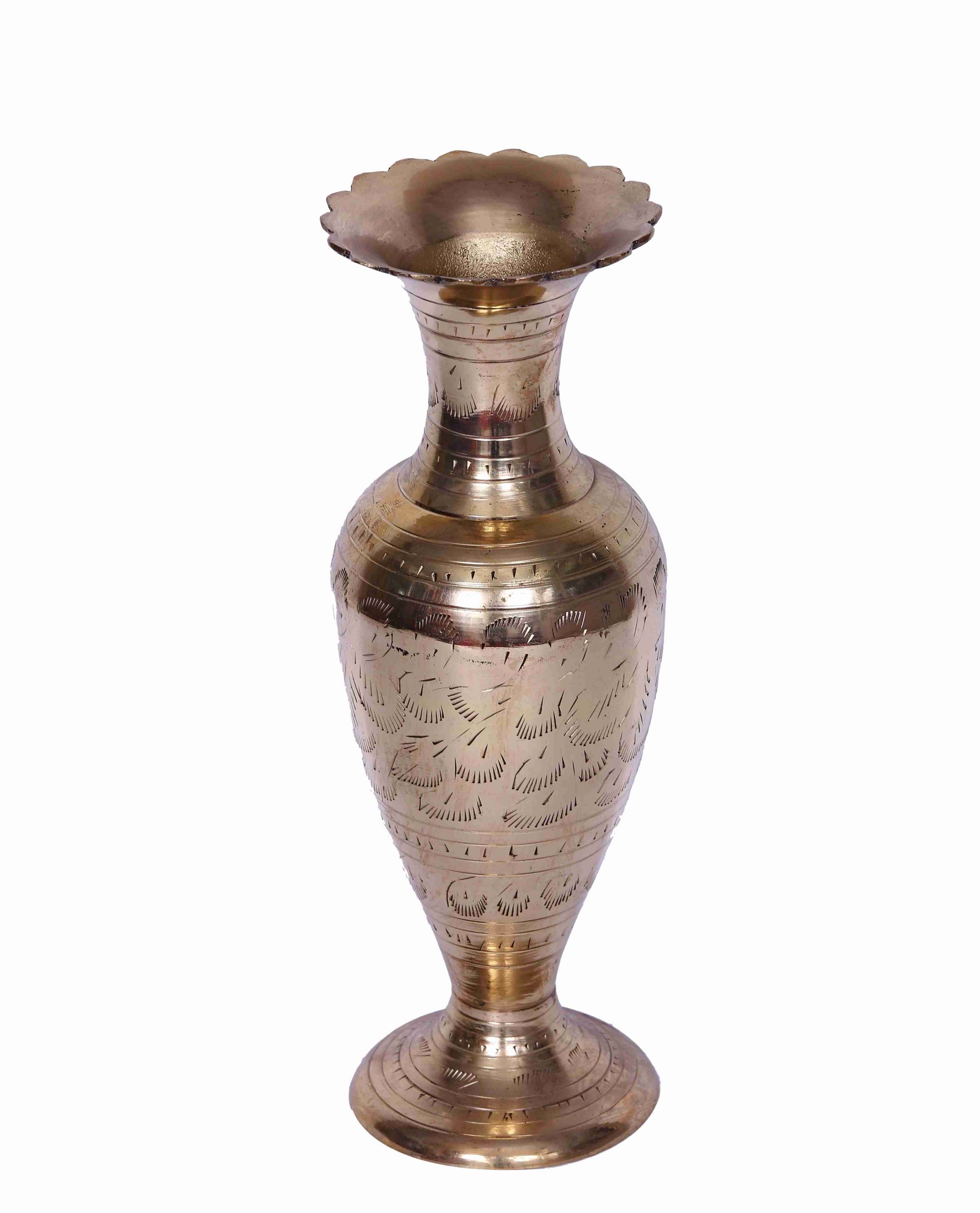 The warm golden hue of polished brass, combined with intricate motifs and smooth contours, makes it an ideal centerpiece for living rooms, pooja spaces, or hallways. Whether adorned with fresh blooms or displayed as a standalone décor item, this flower vase adds a touch of sophistication and cultural richness to your interiors.