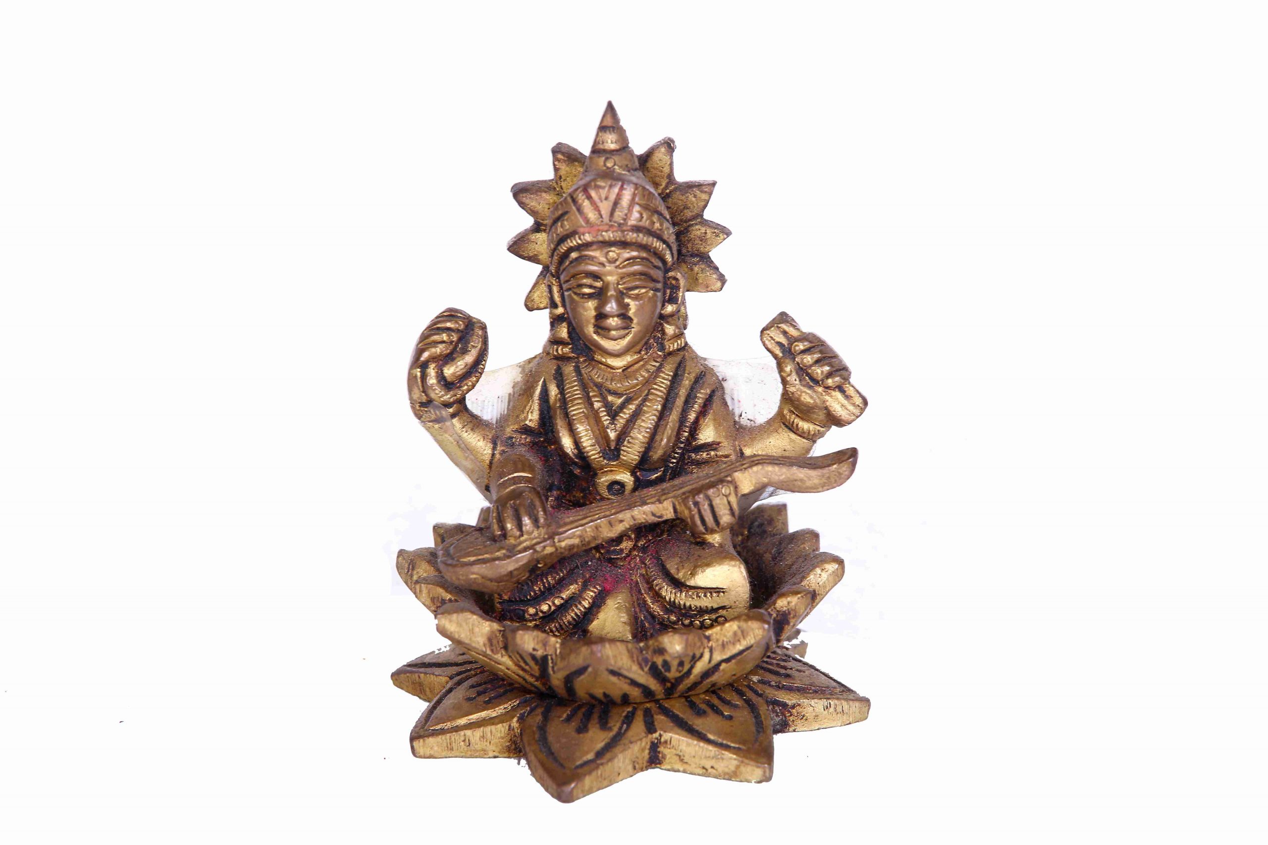 Invite the blessings of Goddess Saraswathi into your life with this timeless brass idol from Poompuhar —