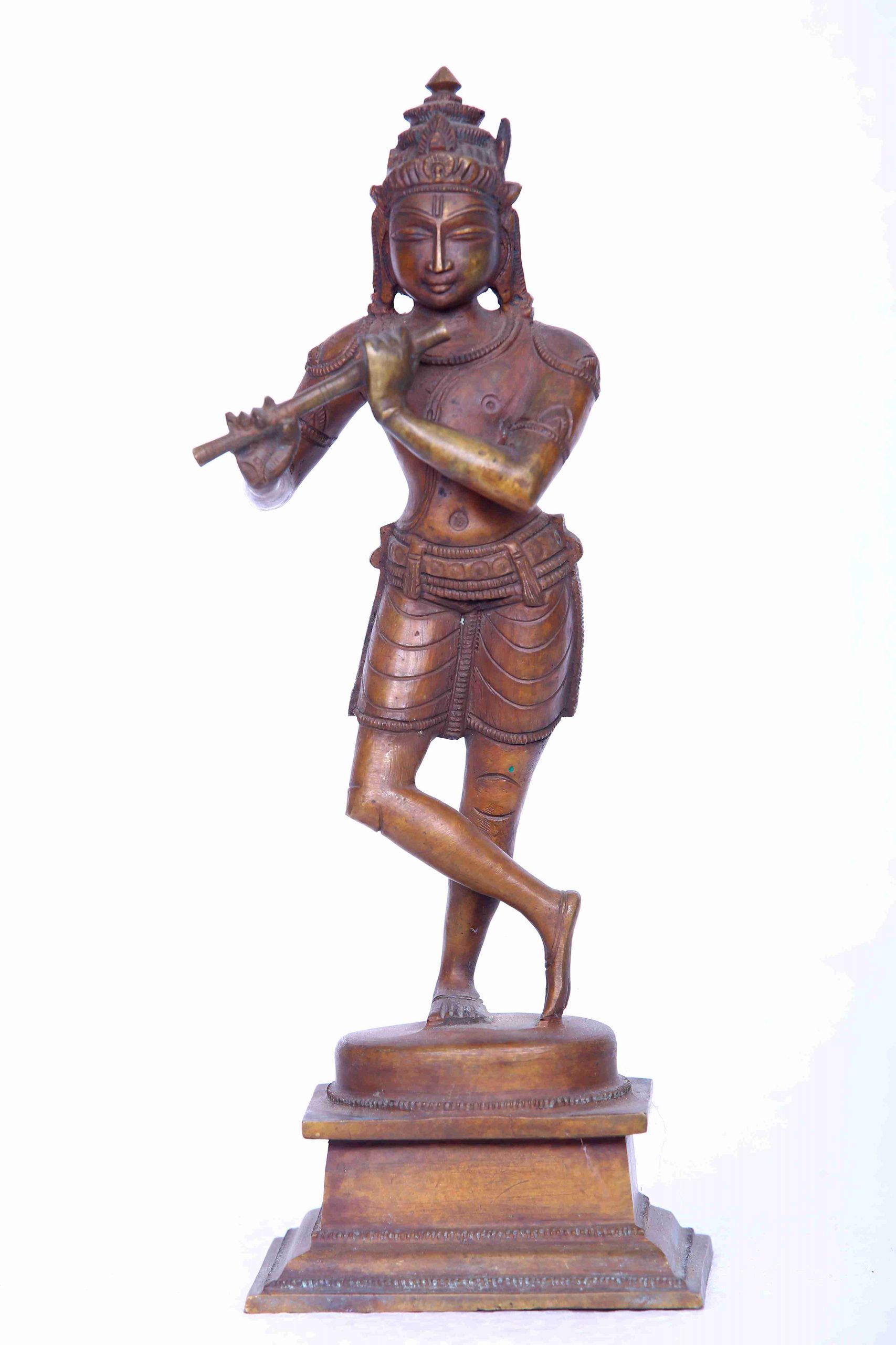 Grace your home with the divine presence of Lord Krishna with this exquisitely crafted 10-inch Bronze Flute Krishna statue. A masterpiece of traditional Indian metalwork, this sculpture showcases Krishna in his signature tribhanga (three-bend) posture, playing his enchanting flute, symbolizing love, wisdom, and devotion.