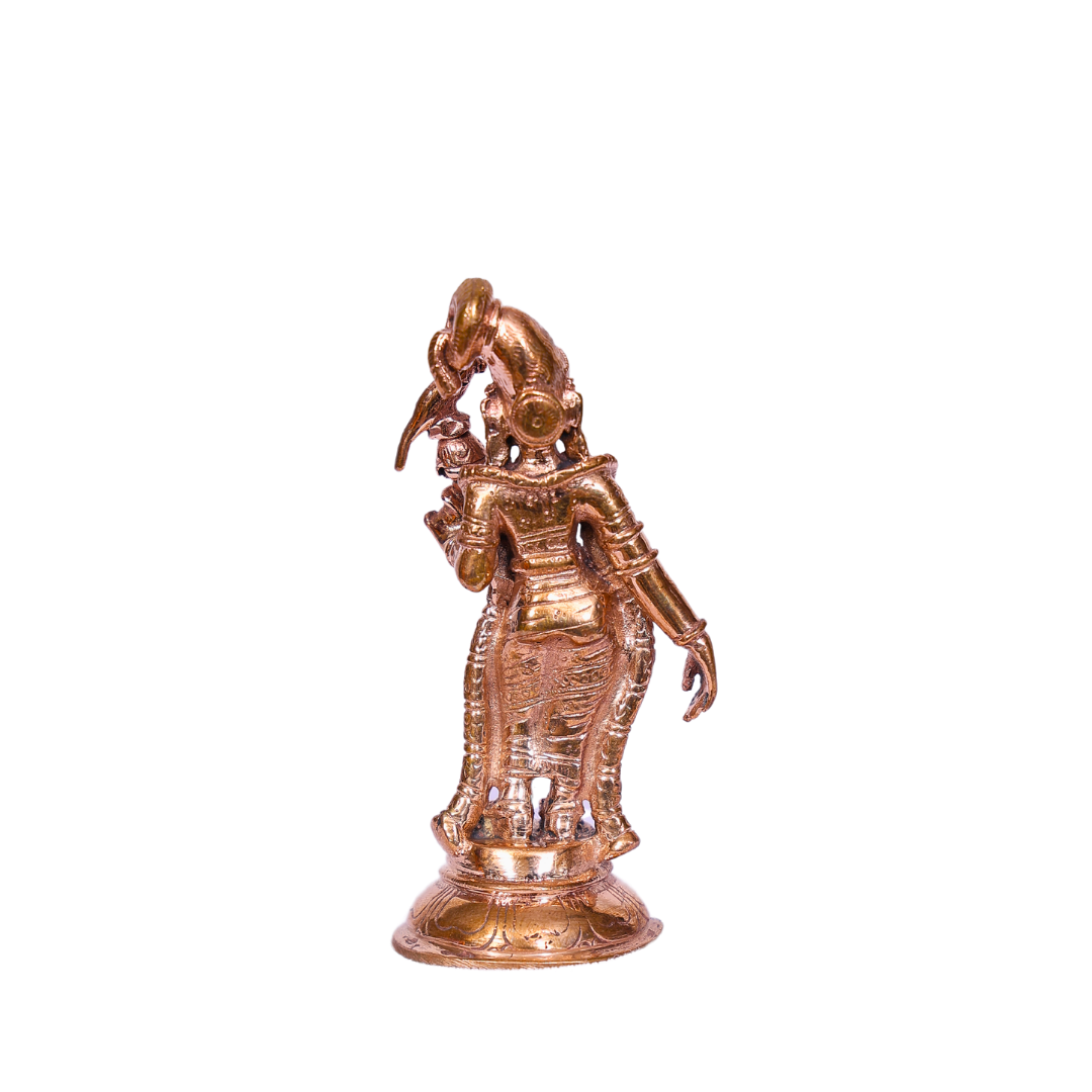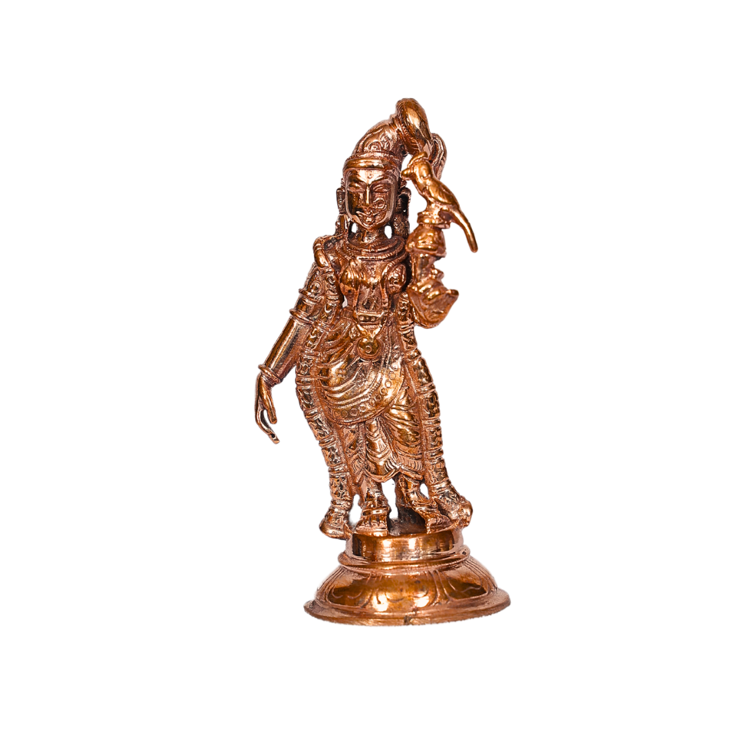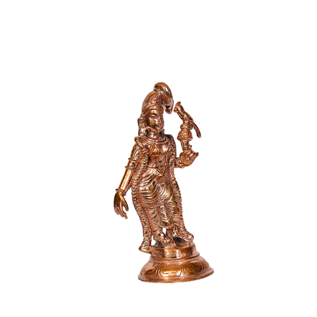 Honor the divine grace and devotion of Saint Aandal, the revered Tamil saint and poetess, with this beautifully handcrafted 4-inch Bronze Aandal Statue. Aandal, an ardent devotee of Lord Vishnu, is celebrated for her deep love, purity of devotion, and her poetic hymns that are central to the Tiruppavai and Nacciyar Tirumoli. This meticulously crafted bronze statue captures her grace, elegance, and divine energy, making it a perfect addition to your pooja room, altar, or spiritual space, bringing peace, devotion, and blessings into your home.