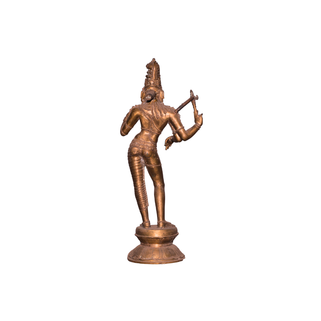 This exquisite 24-inch Bronze Ardhanarishwarar statue beautifully symbolizes the union of Shiva and Parvati, representing the perfect balance of masculine and feminine energies. Crafted by skilled artisans, this statue combines detailed carvings with a classic antique bronze finish, making it a captivating addition to any sacred or decorative space.