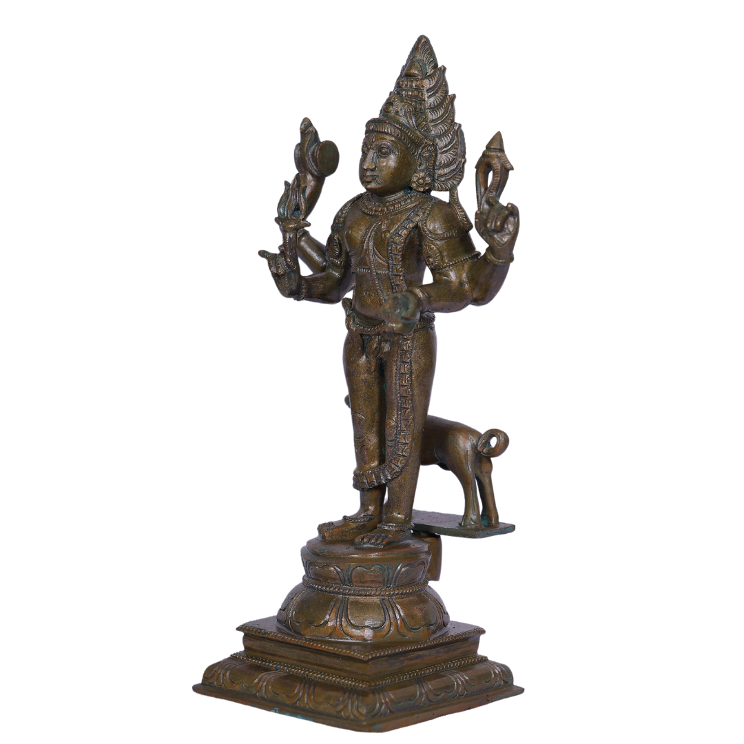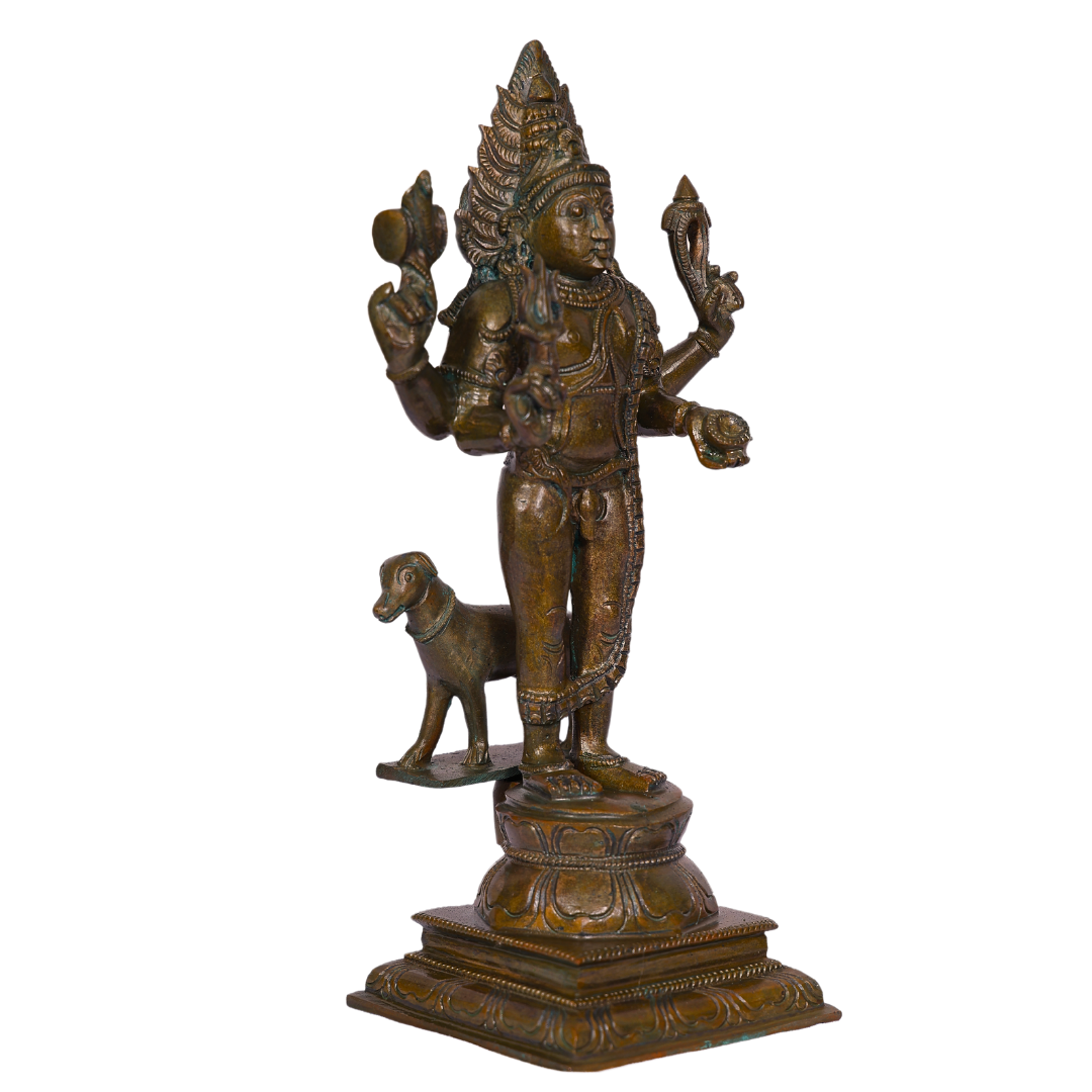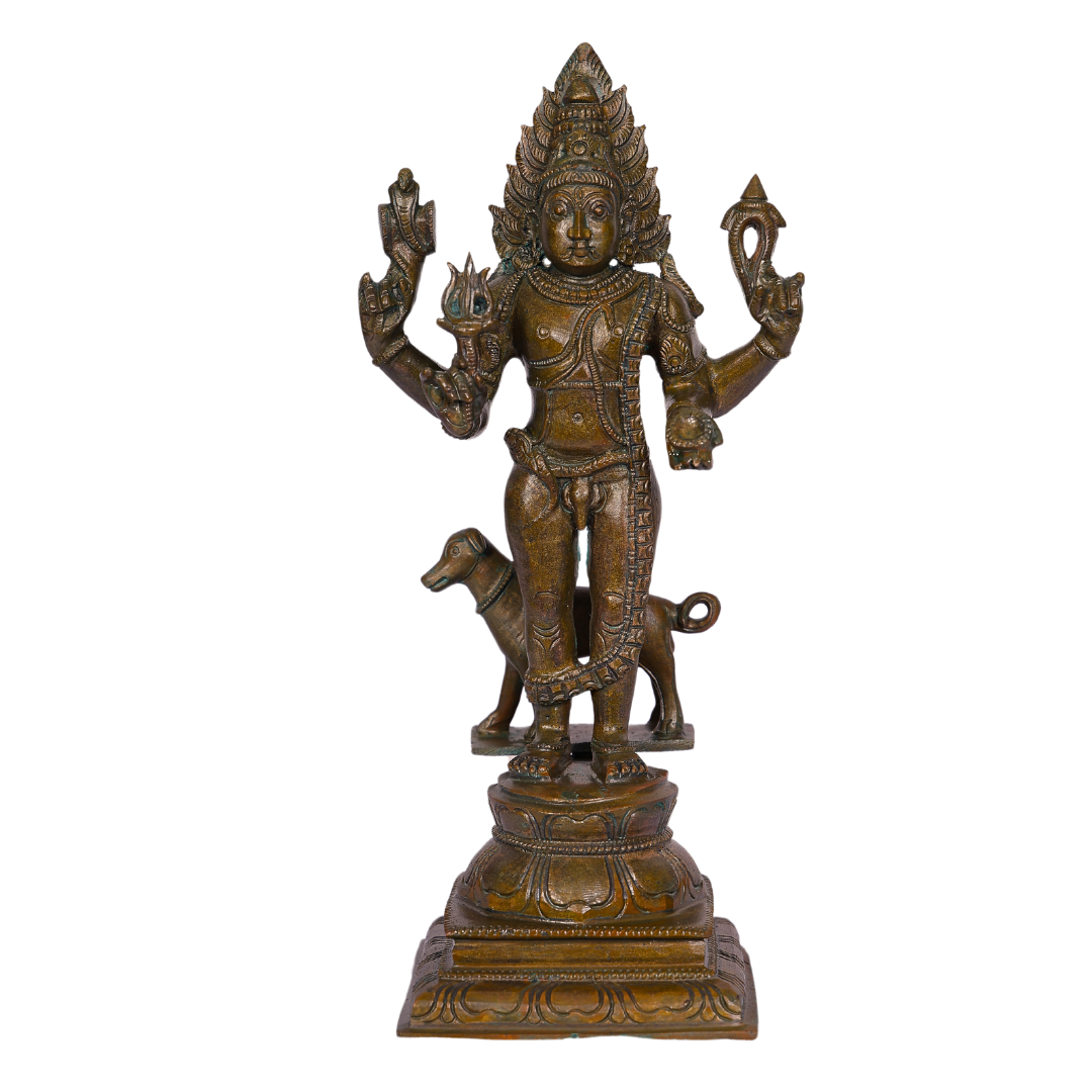 The 12-Inch Bronze Bhairavar Statue is a striking and powerful representation of Lord Bhairavar, one of the fiercest and most revered forms of Lord Shiva. Known for his qualities of protection, fearlessness, and justice, Lord Bhairavar is worshipped for his ability to remove obstacles and safeguard his devotees. Crafted with exceptional detail, this bronze statue radiates strength and divine energy, making it an ideal addition to any spiritual space or altar.