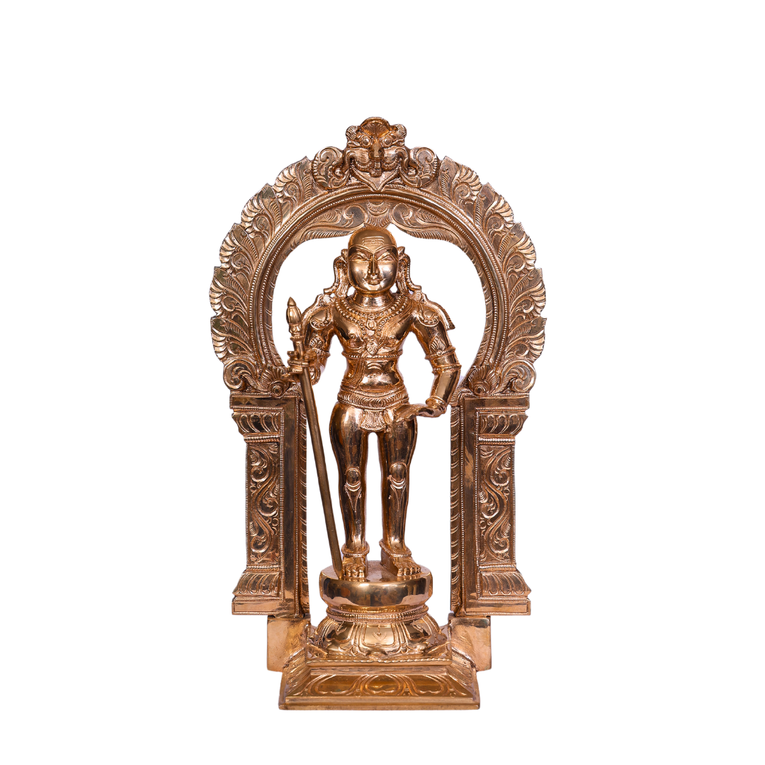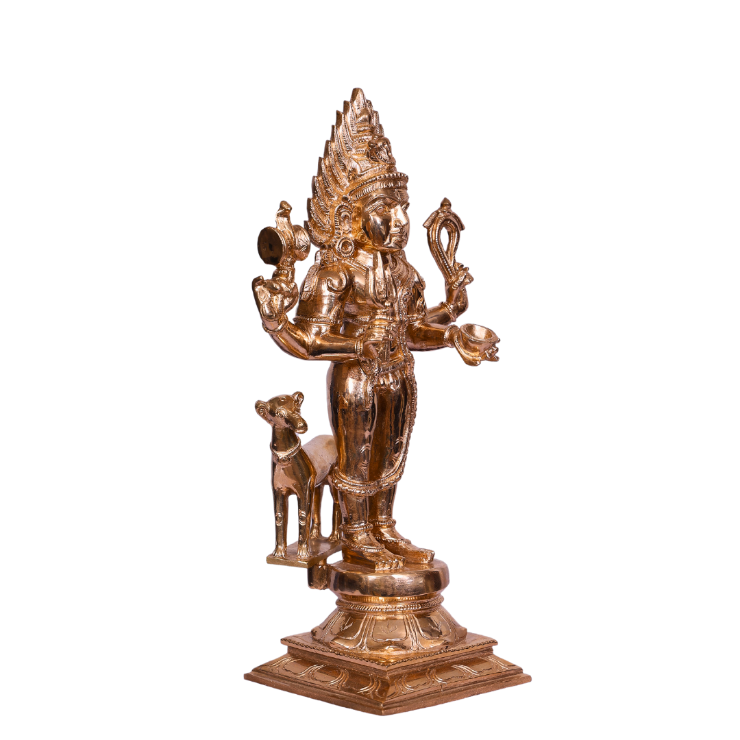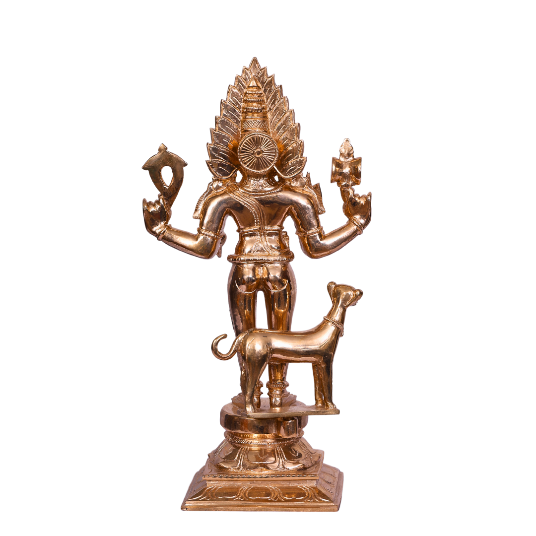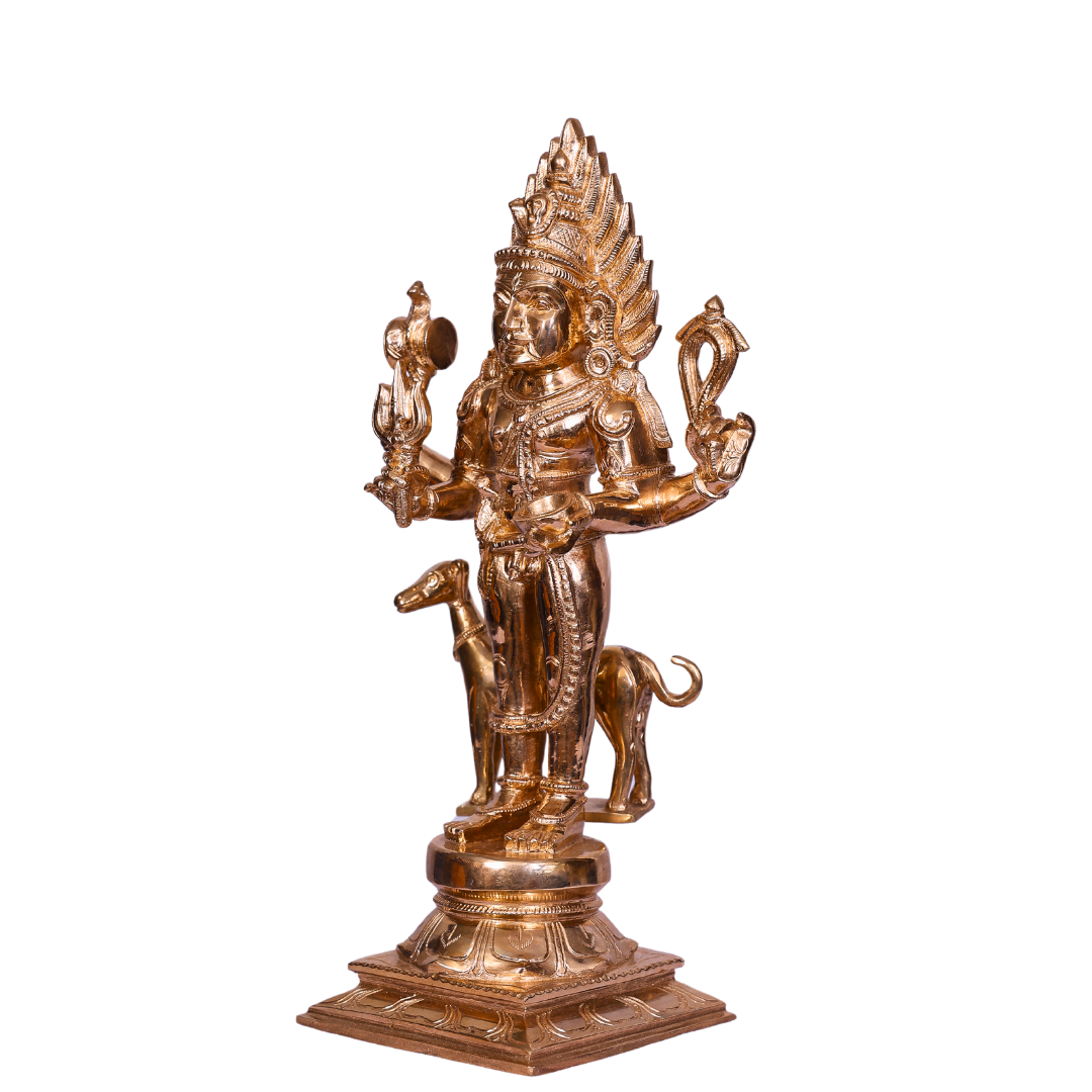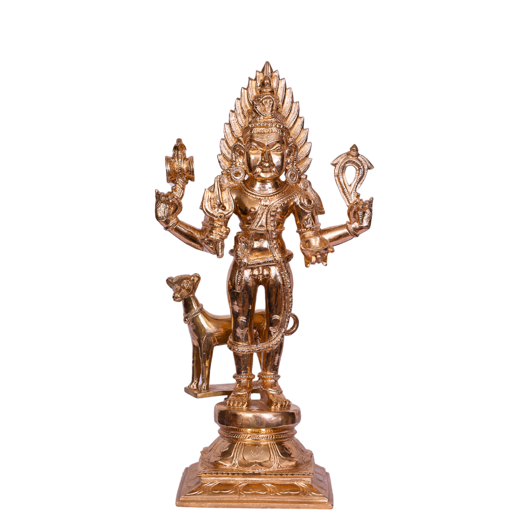 This meticulously crafted 18-inch Bronze Bhairavar Statue represents Bhairavar, one of the most powerful and revered forms of Lord Shiva in Hindu mythology. Known as the guardian of the universe and protector against negative forces, Bhairavar is a fierce deity who embodies both destruction and protection. Worshipped for his ability to annihilate evil, Bhairavar is often depicted with a fearsome expression, multiple arms, and holding weapons that symbolize his supreme power. This finely detailed statue, made from high-quality bronze, radiates divine strength and protection, making it an ideal addition to your home temple, prayer room, or sacred space.