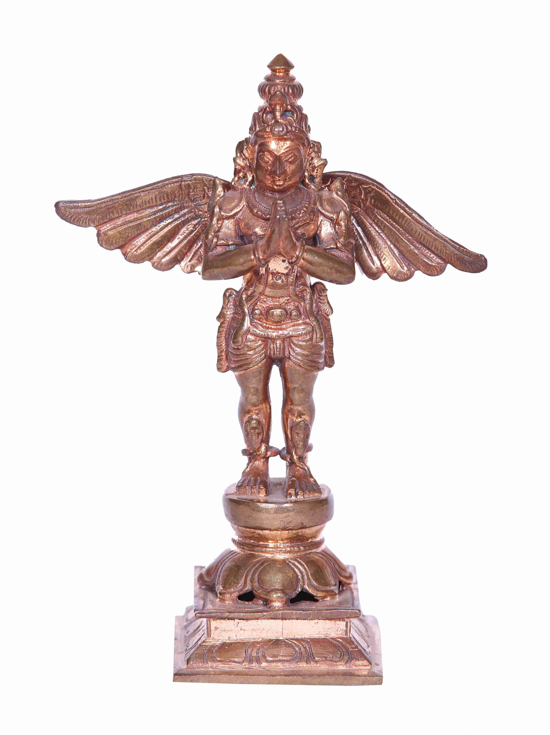 Crafted with exquisite precision by skilled artisans of Tamil Nadu, the Bronze Garudan embodies devotion, strength, and traditional South Indian bronze casting heritage. Garudan, the revered divine vehicle (vahana) of Lord Vishnu, is depicted in a dynamic posture, ready to serve his Lord with unwavering loyalty and power.