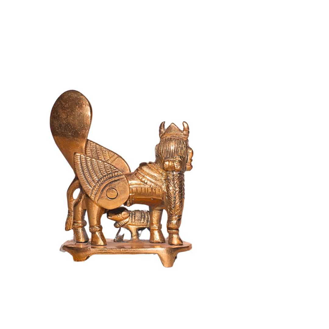 - Design: The Kaamadhenu Statue showcases the divine cow in a gentle and serene posture. She is depicted with a graceful form, with subtle detailing of her horns, tail, and body, capturing her divine essence. In many depictions, Kaamadhenu is shown with her calf, symbolizing nourishment and care, though in this statue, the focus is on her strength and grace. The craftsmanship brings out the purity and sanctity that Kaamadhenu represents.