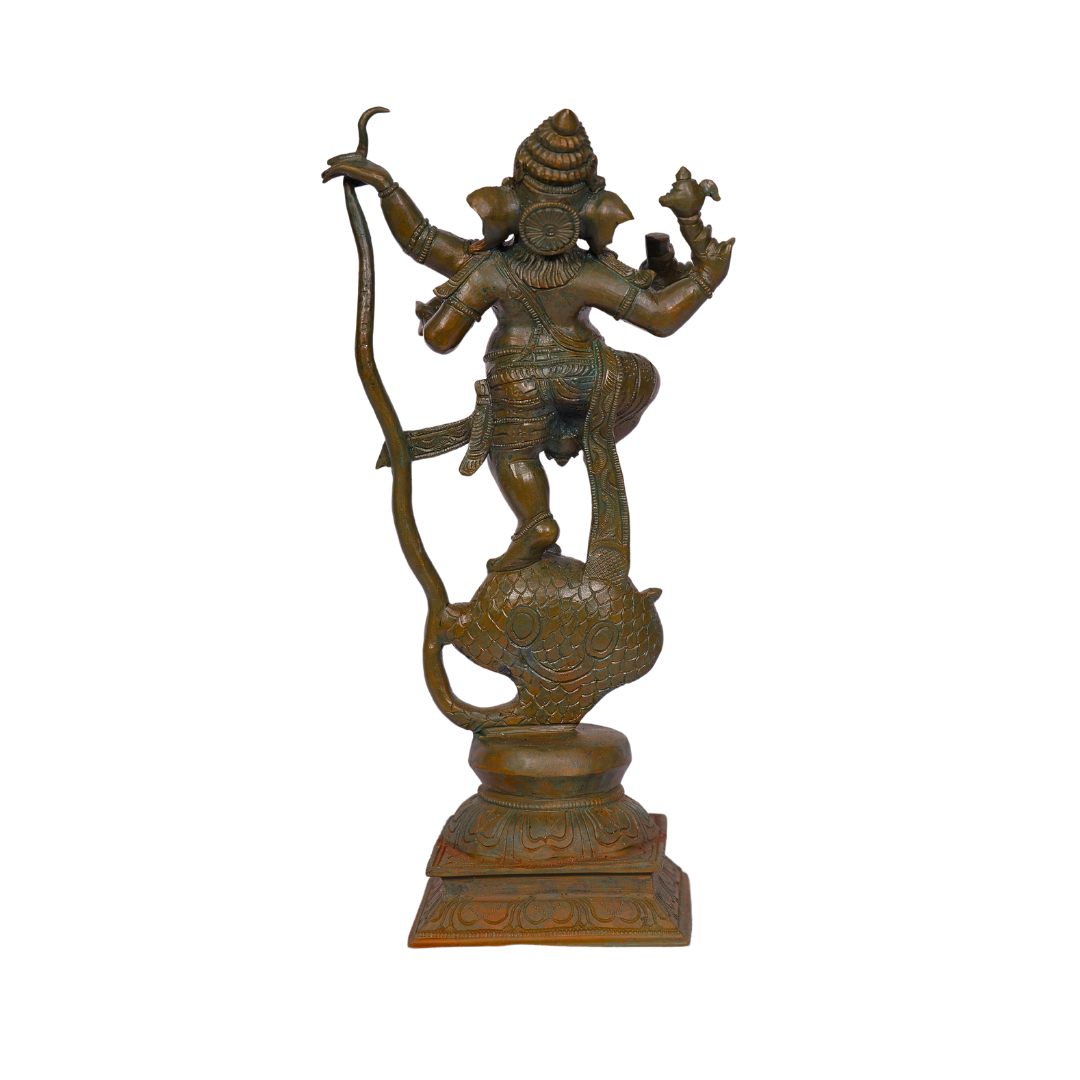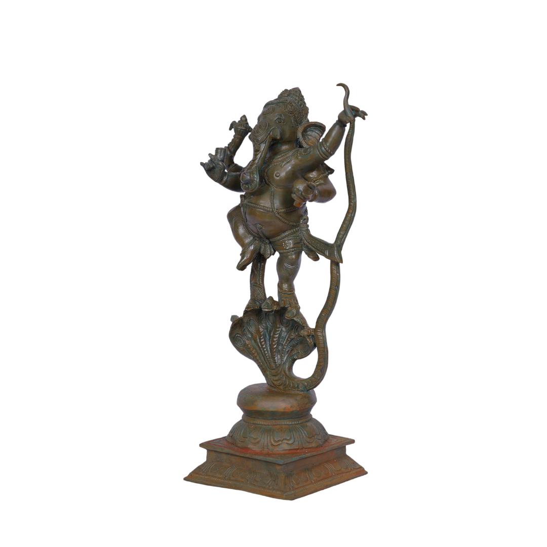 The 13-Inch Bronze Kalinga Vinayagar Statue is a beautifully crafted depiction of Lord Ganesha, also known as Vinayagar, in his powerful form as Kalinga Vinayagar. This form represents Lord Ganesha’s victory over the serpent demon Kalinga, symbolizing the triumph of wisdom and divine strength over evil forces. Handcrafted from premium-quality bronze, this statue is a perfect addition to your spiritual space, whether it be a temple, altar, or home.