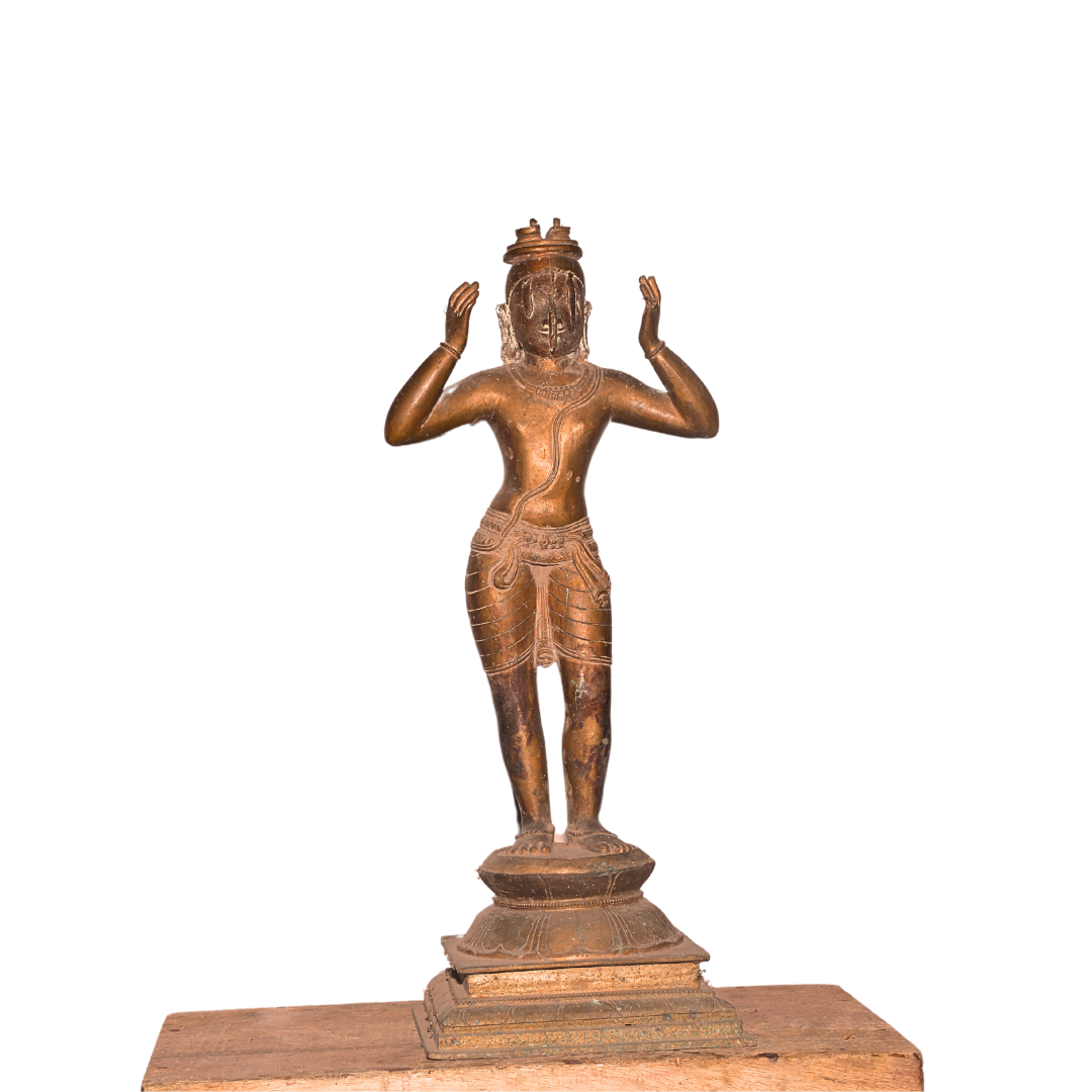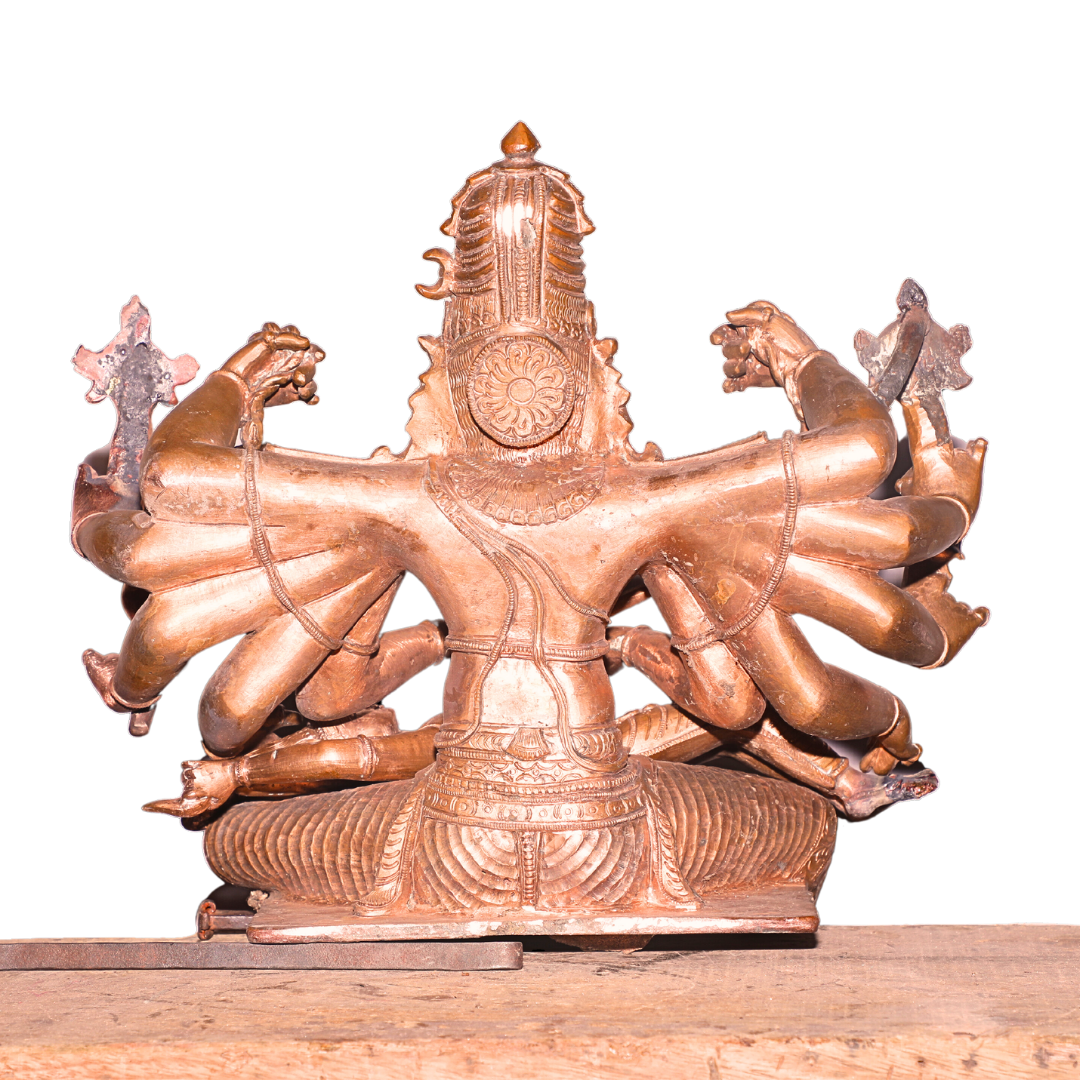 This stunning 18-inch Bronze Narasimhar statue beautifully captures the divine strength and protection of Lord Narasimha, the lion-faced incarnation of Lord Vishnu. Crafted with exquisite detail and an antique bronze finish, this statue is a powerful representation of courage, justice, and the triumph of good over evil, making it a perfect addition to any sacred space or home décor.