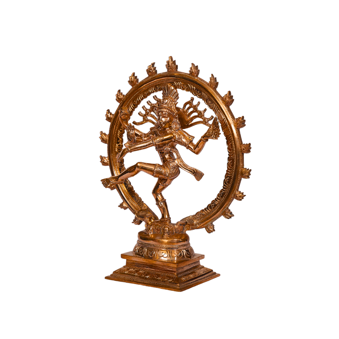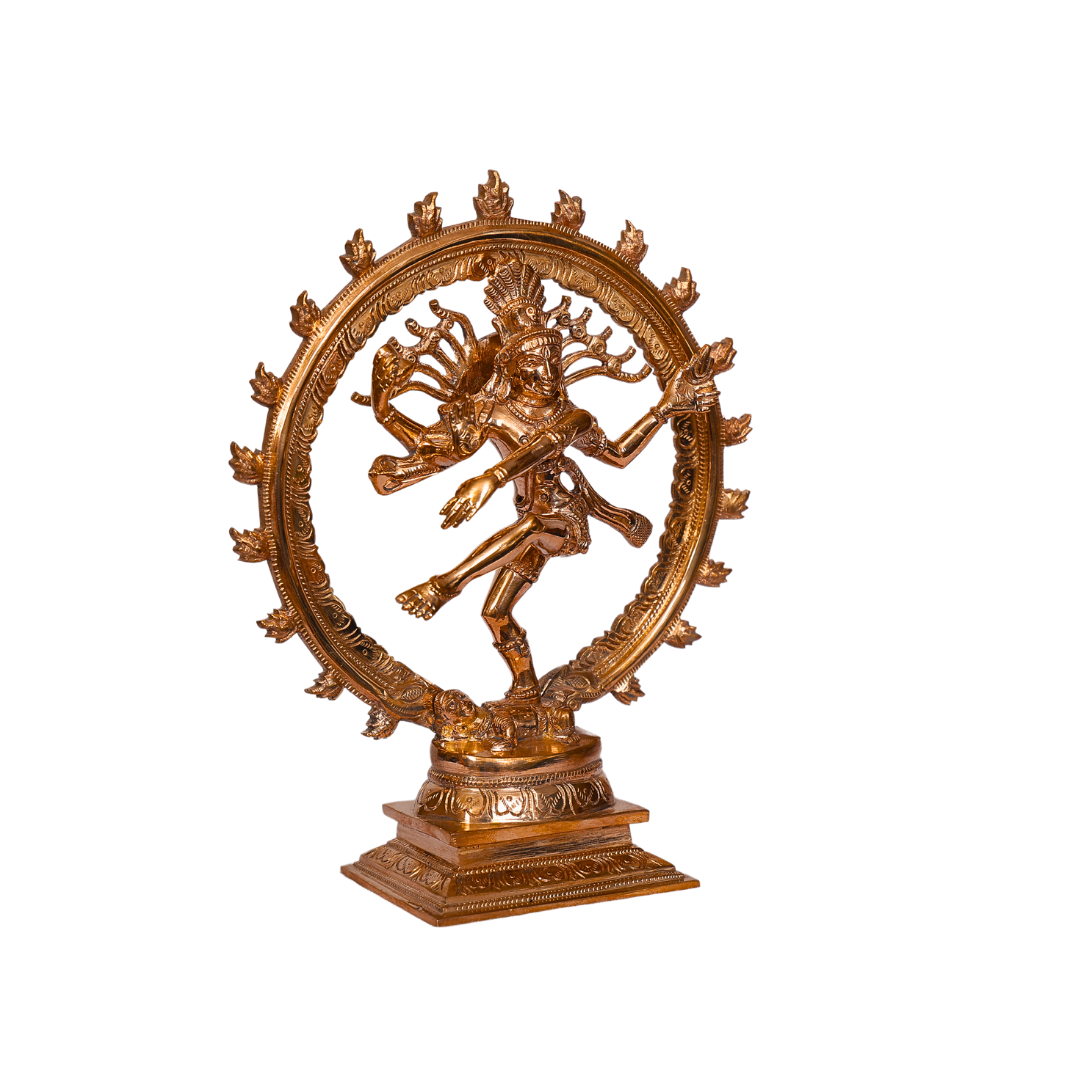 - Design: The statue depicts Lord Nataraja, the cosmic dancer, in his iconic pose, surrounded by a ring of flame symbolizing the cycle of creation and destruction. With one foot raised in dance and the other resting on a demon (symbolizing the destruction of ignorance), Lord Shiva radiates divine grace, power, and serenity. His hands hold symbols of creation, protection, and destruction, making this statue a powerful spiritual emblem.