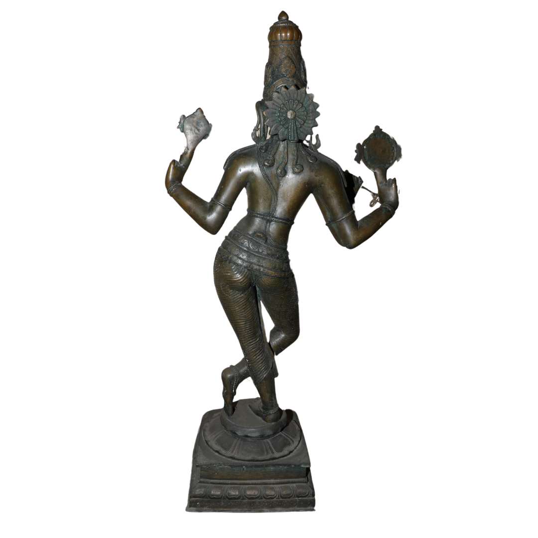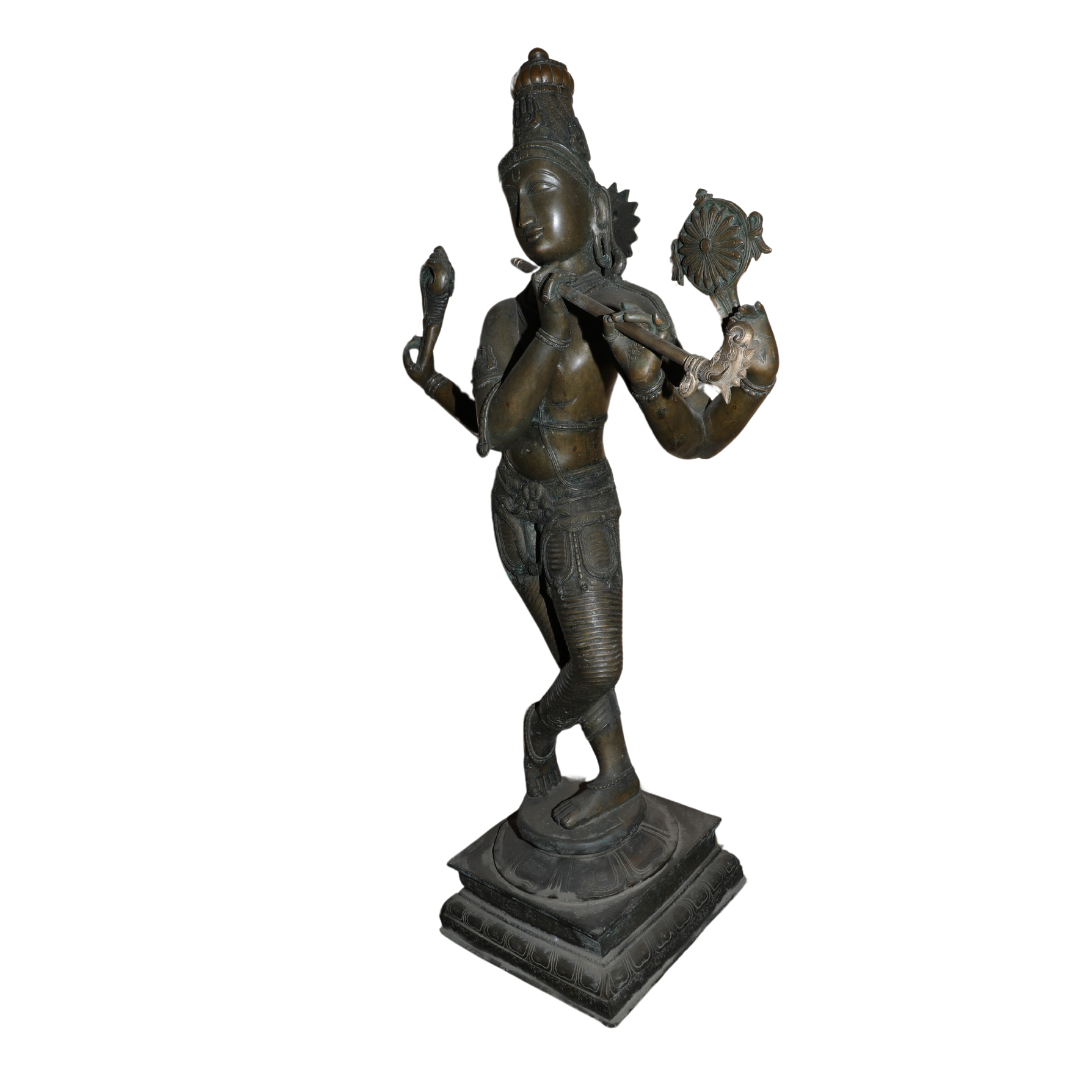- Finish: Antique bronze finish with finely detailed patterns and textures that enhance the visual richness of the statue. The fluid lines of Krishna’s attire, the flowing hair, and the fine details of the flute give the statue a lifelike quality that adds to its spiritual presence.