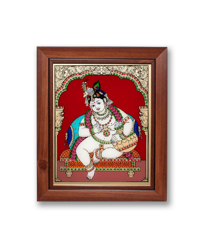 This exquisite Glass Painting of Lord Balaji captures the divine presence of the revered deity in stunning detail. Handcrafted by skilled artisans, this painting showcases rich golden hues and intricate detailing that bring out the grace and majesty of Lord Venkateswara. The vibrant colors and shimmering accents enhance the sacred aura, making it a perfect addition to your home, temple, or gifting collection.