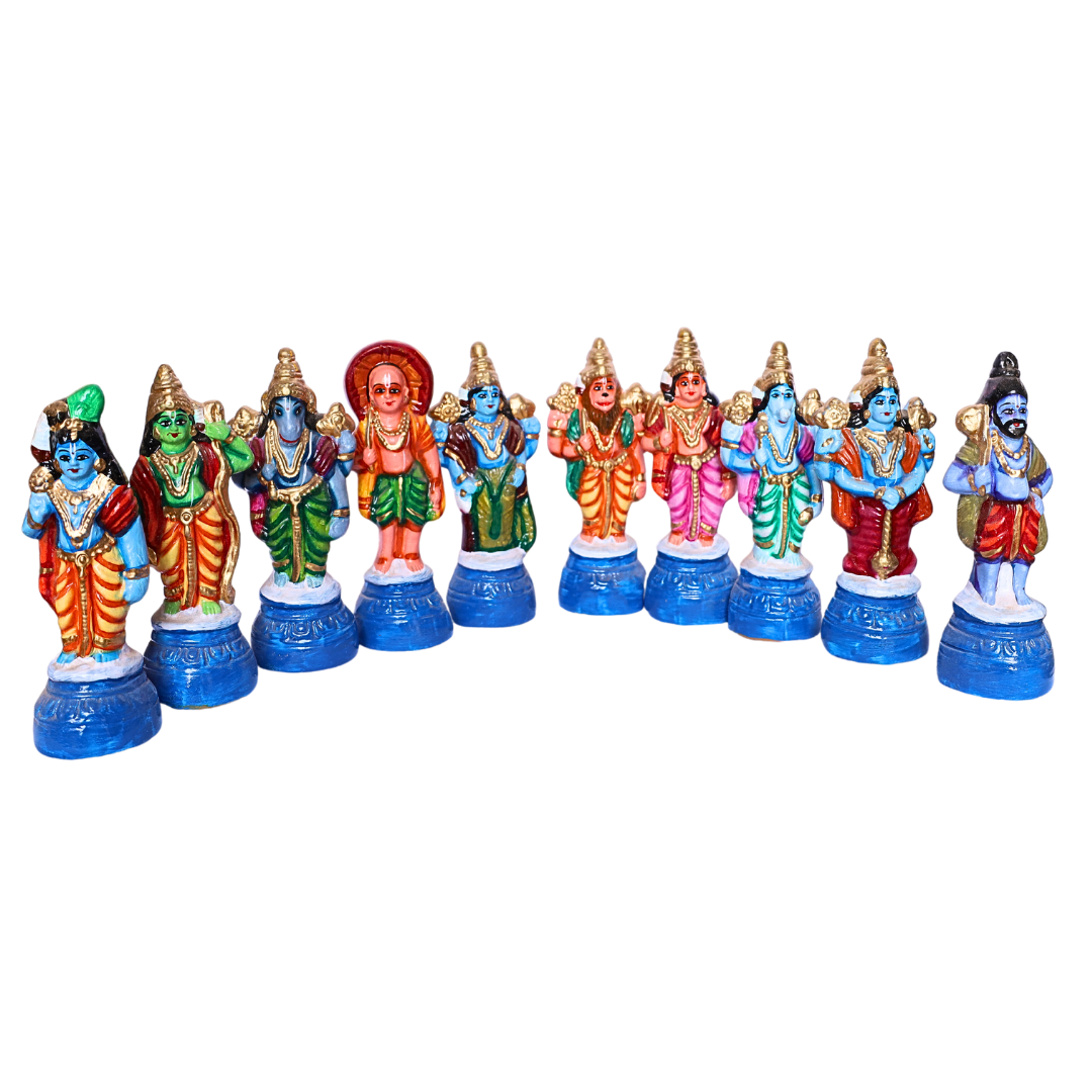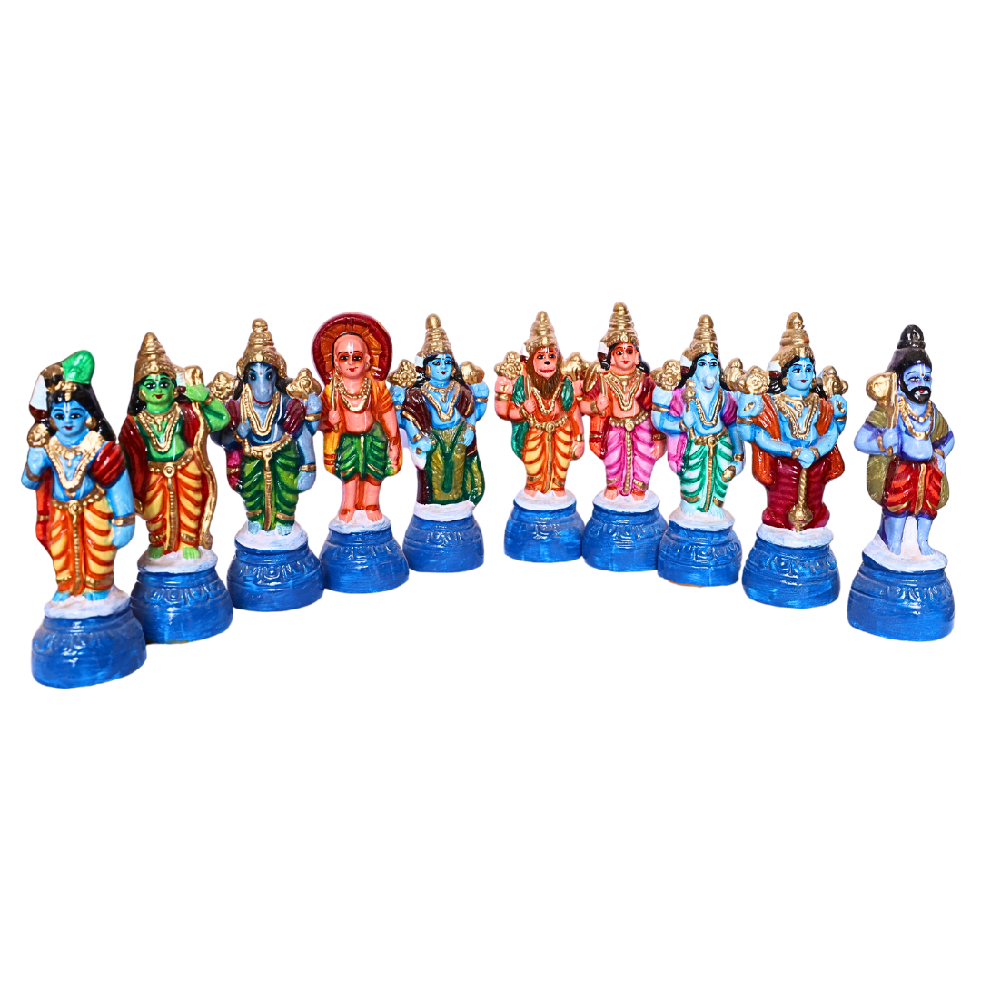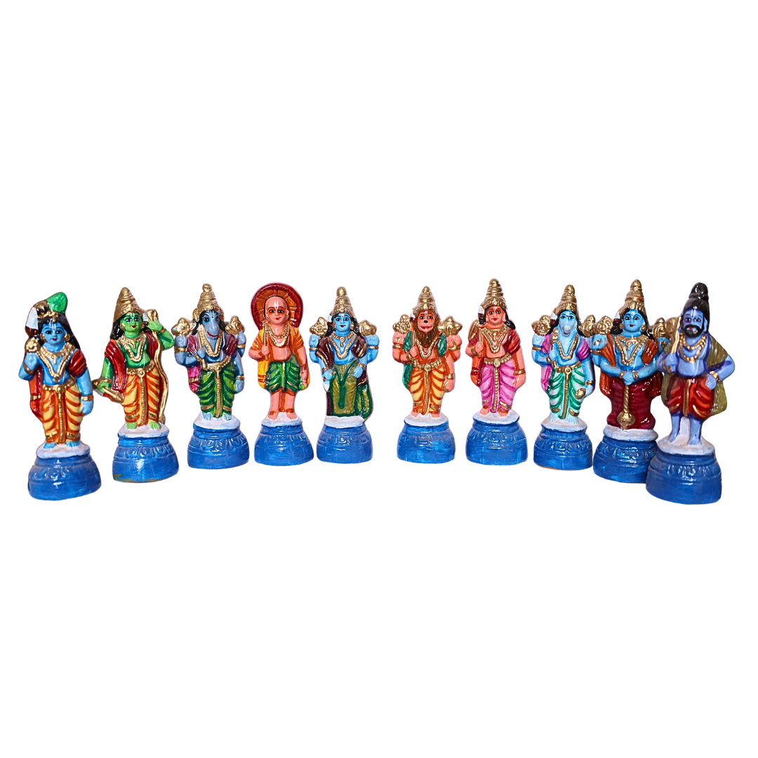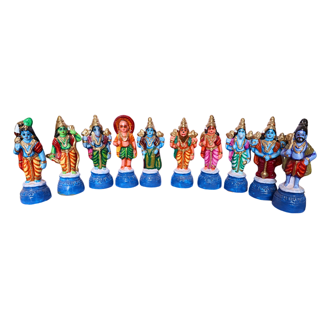 Celebrate the divine incarnations of Lord Vishnu with this exquisite Paper Mache Dhasavatharam Statue. Standing at 2.3 inches, this beautifully handcrafted piece showcases the Ten Avatars (Dhasavatharam) of Lord Vishnu, each representing a unique form through which the god incarnated to restore cosmic order. This Paper Mache statue elegantly captures these ten forms—Matsya, Kurma, Varaha, Narasimha, Vamana, Parashurama, Rama, Krishna, Buddha, and Kalki—with intricate detailing and vibrant colors, making it a perfect addition to your home or pooja room.