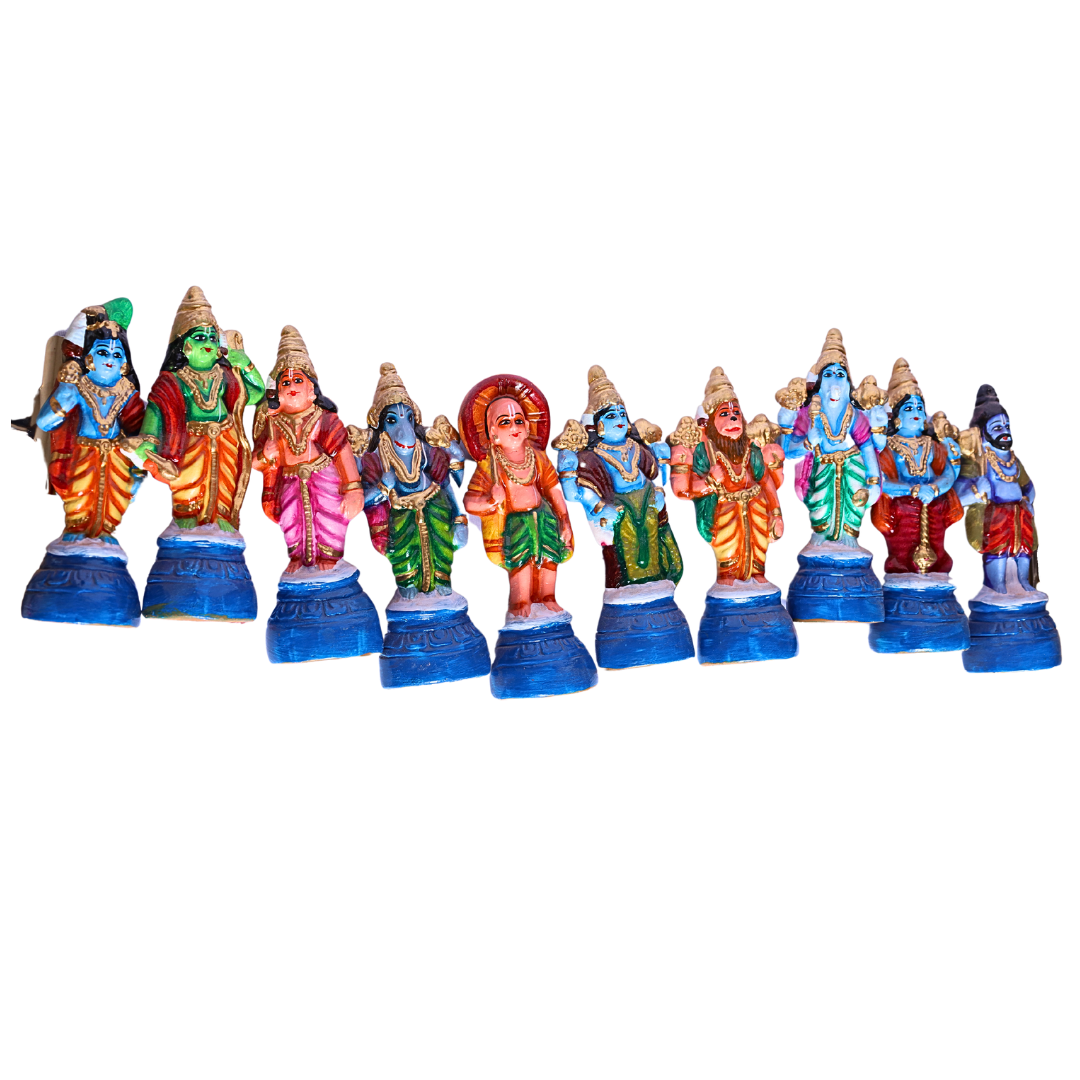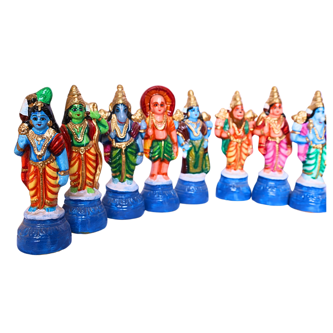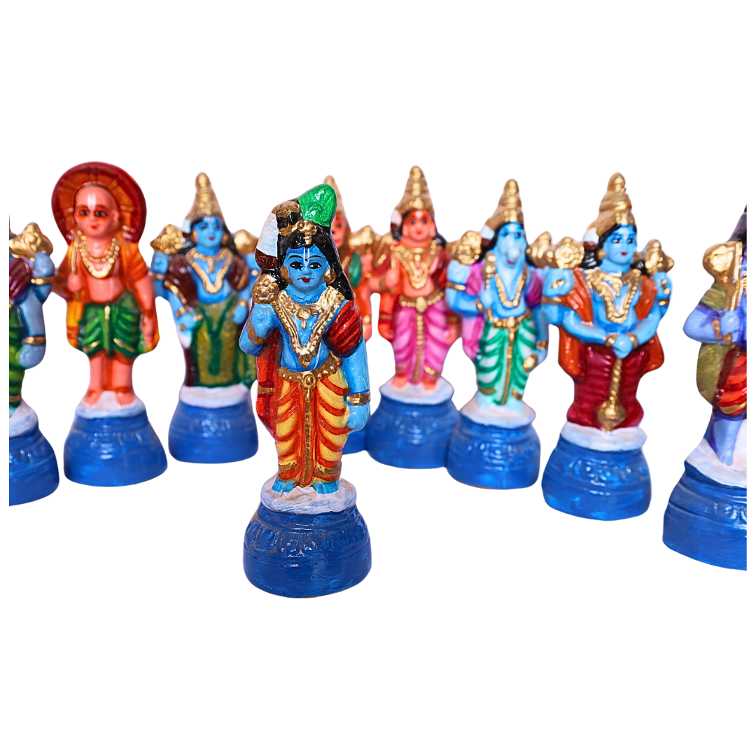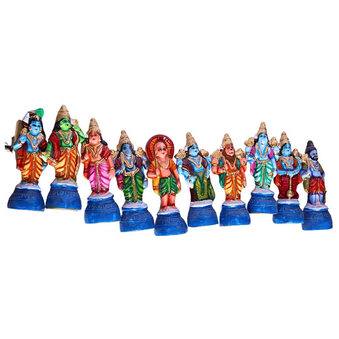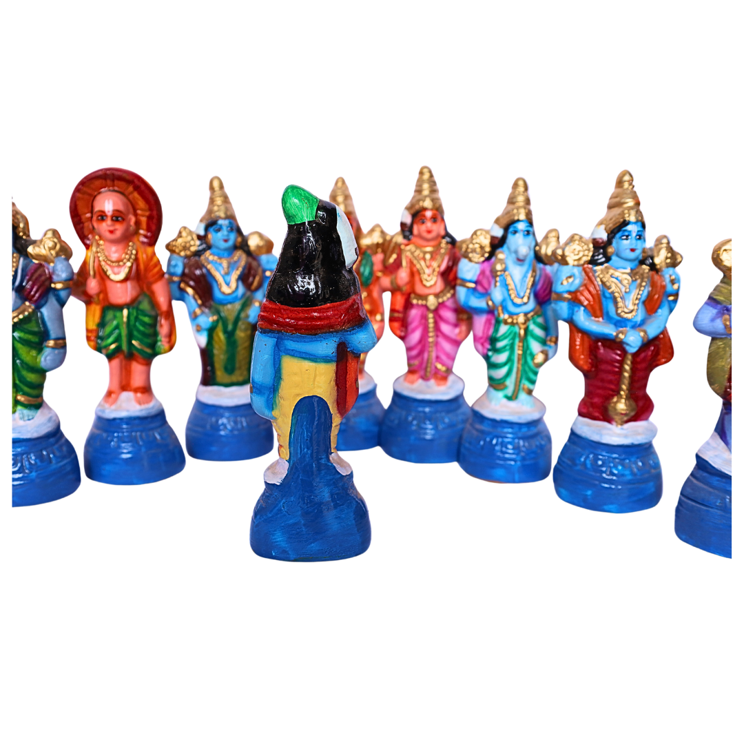 Celebrate the divine incarnations of Lord Vishnu with this exquisite Paper Mache Dhasavatharam Statue. Standing at 2.3 inches, this beautifully handcrafted piece showcases the Ten Avatars (Dhasavatharam) of Lord Vishnu, each representing a unique form through which the god incarnated to restore cosmic order. This Paper Mache statue elegantly captures these ten forms—Matsya, Kurma, Varaha, Narasimha, Vamana, Parashurama, Rama, Krishna, Buddha, and Kalki—with intricate detailing and vibrant colors, making it a perfect addition to your home or pooja room.