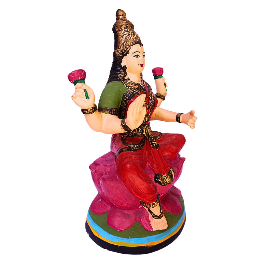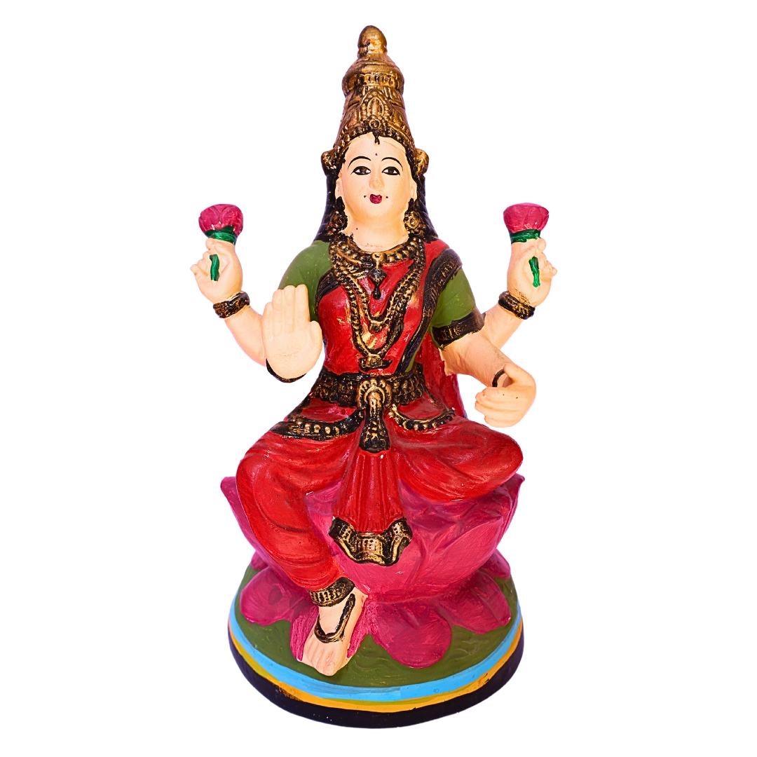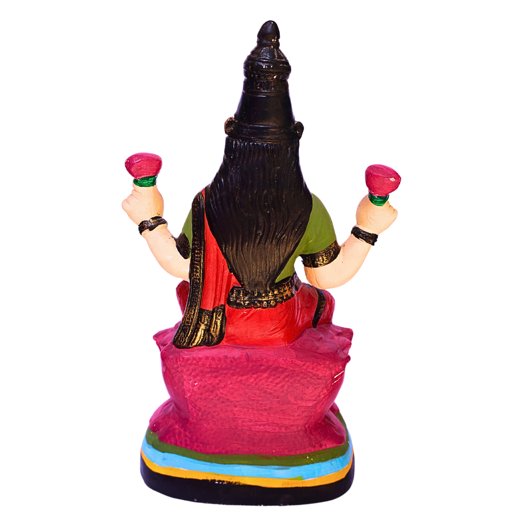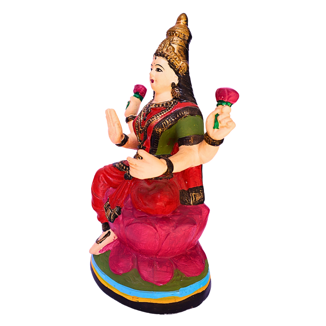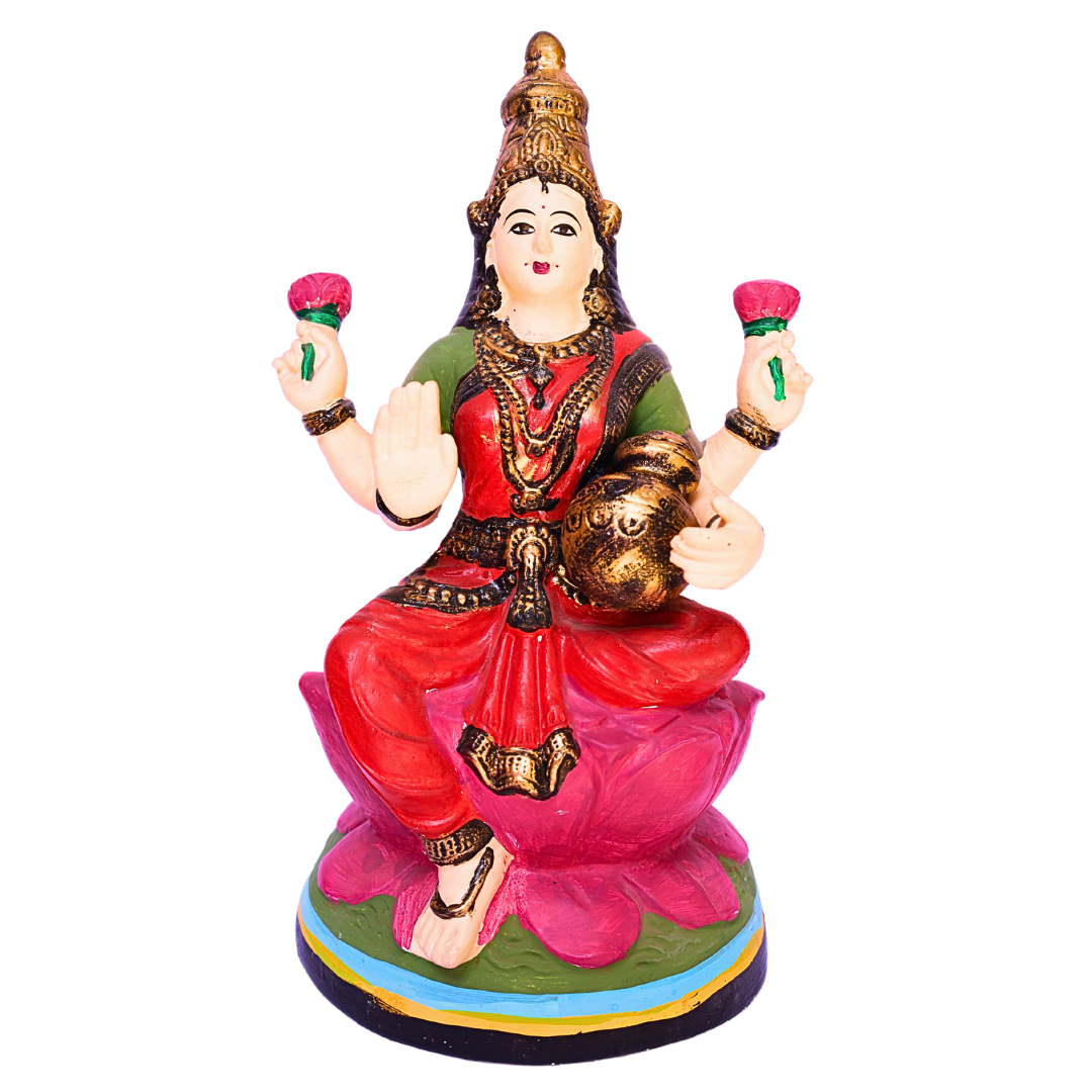 - Intricate Detailing: Hand-painted with exceptional attention to detail, this statue portrays Goddess Lakshmi seated on a lotus, with her hands raised in blessing, showering coins of prosperity. The statue also depicts the goddess adorned in traditional attire and jewelry, adding a rich and sacred touch to her divine presence.