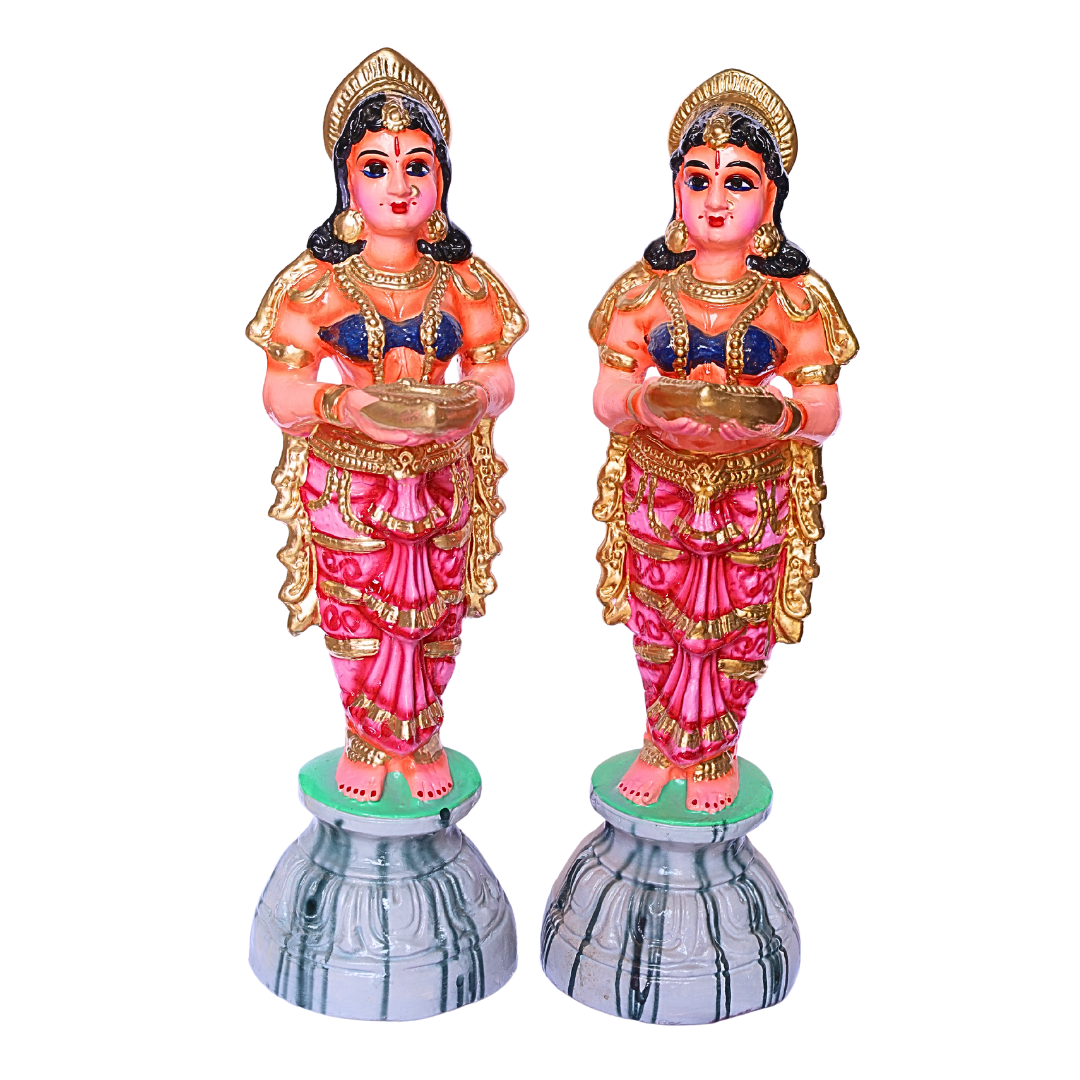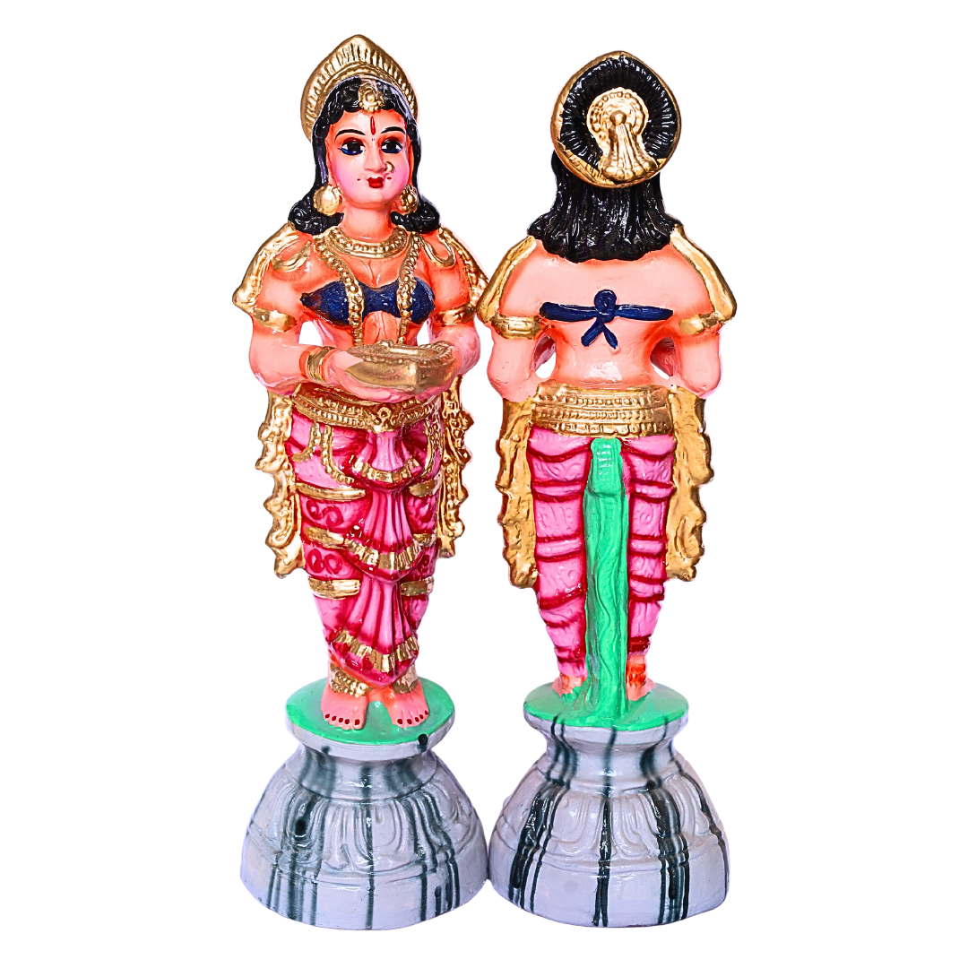 - Material: Crafted from high-quality Paper Mache, this Paavai Vilakku offers both durability and a lightweight design. The material allows for smooth finishes and the intricate detailing that enhances the elegance of the lamp.