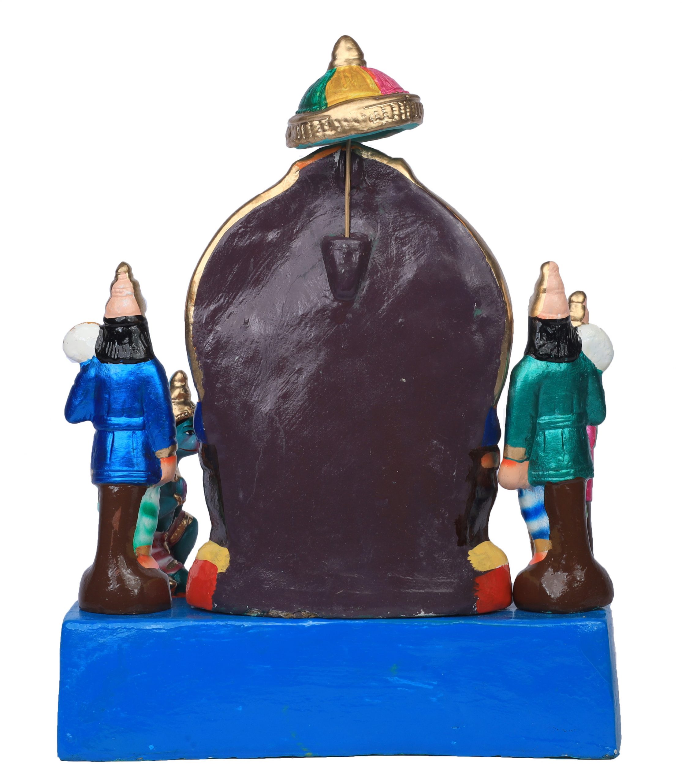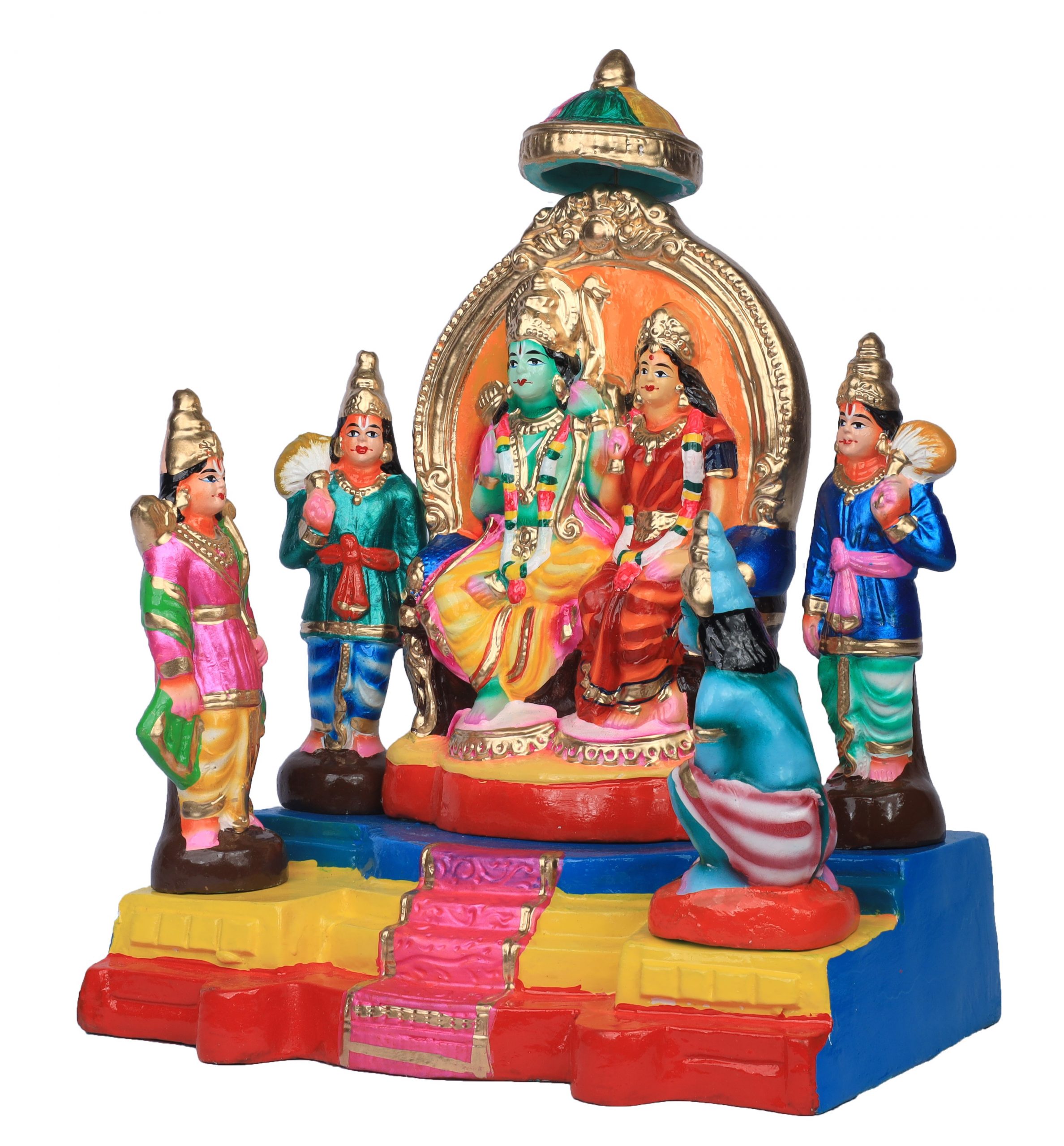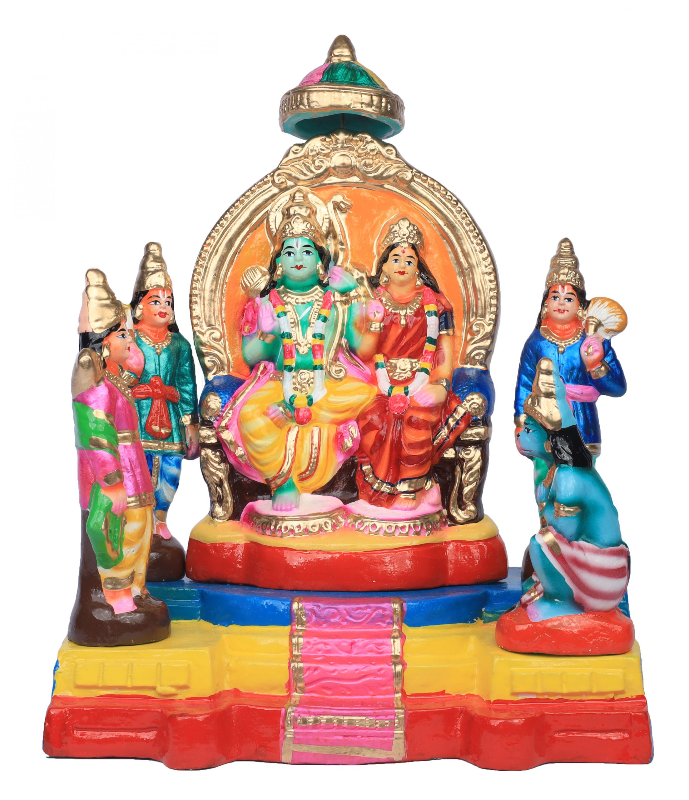 - Elegant Handcrafted Design: This stunning 14-inch set depicts the sacred coronation scene of Lord Rama, known as Pattabishegam, featuring intricate details of this divine event. Each figure is handcrafted from eco-friendly paper mache and hand-painted to capture the regal and spiritual essence of the ceremony.