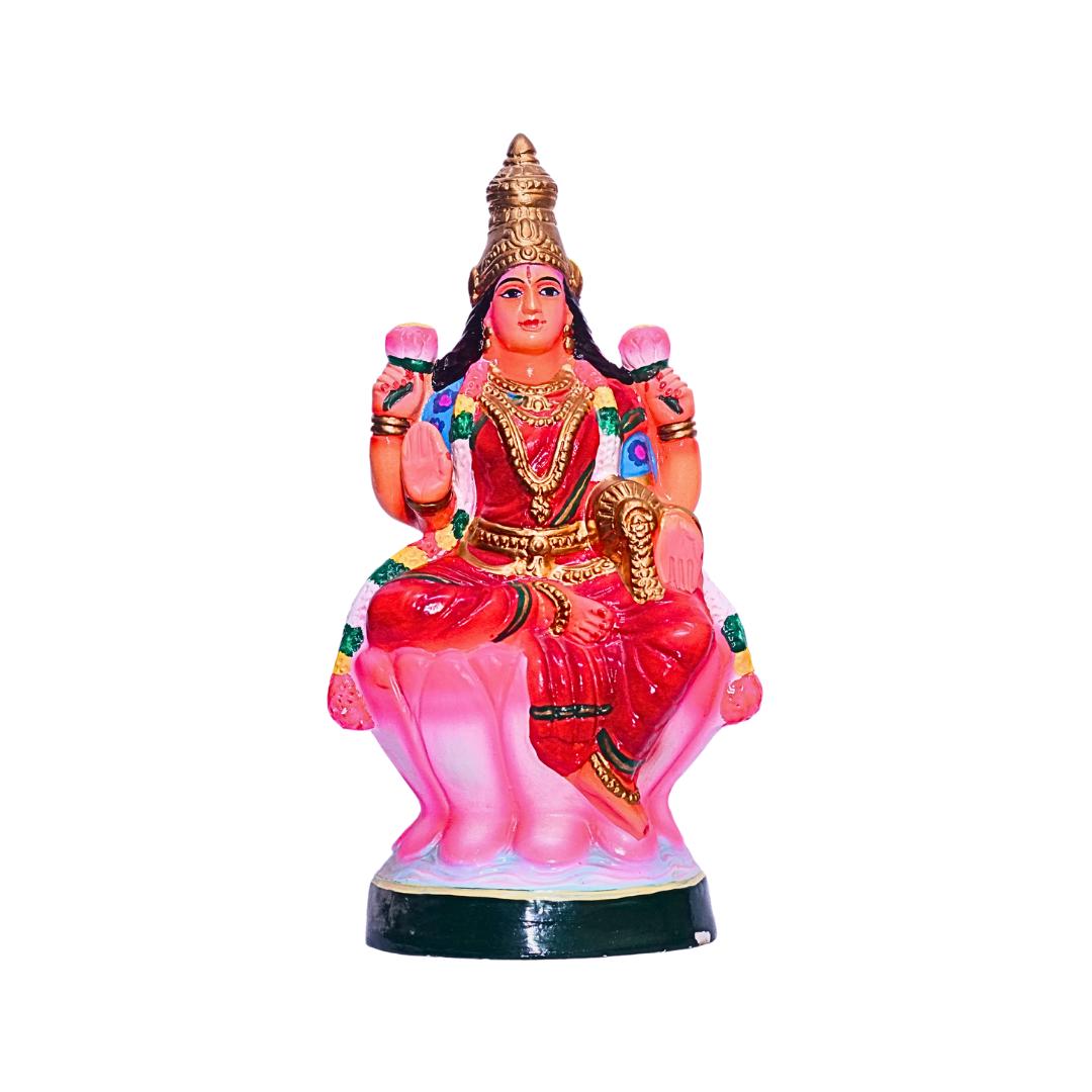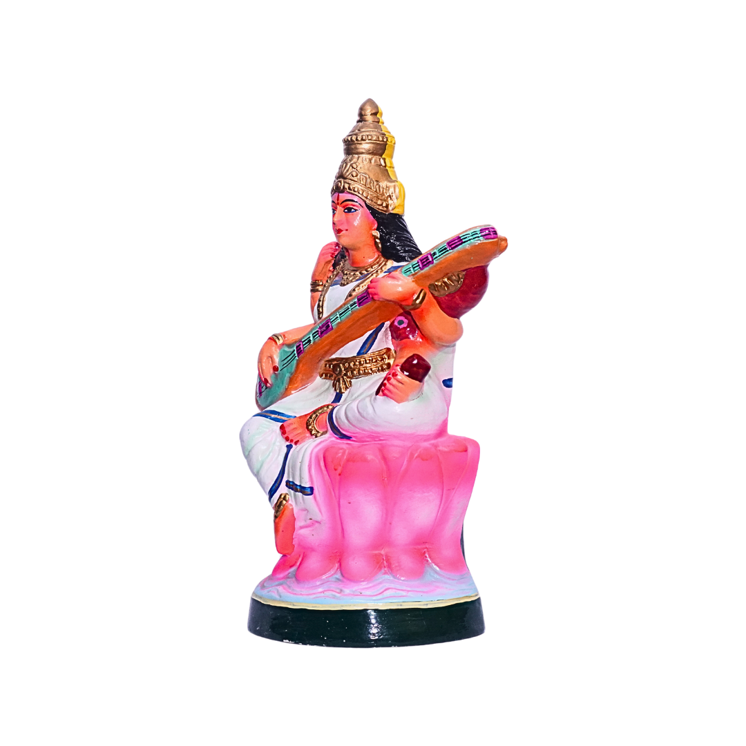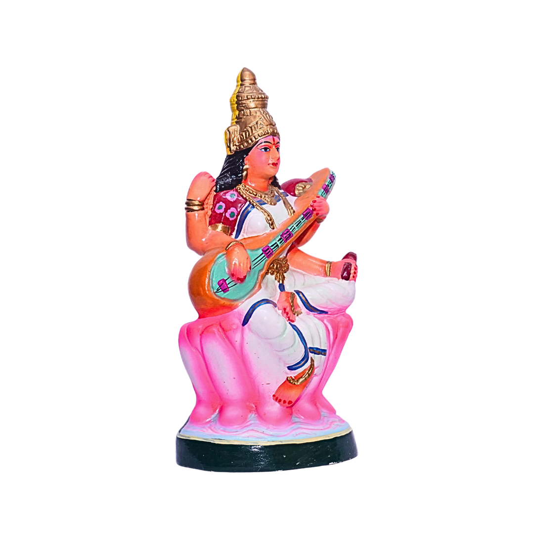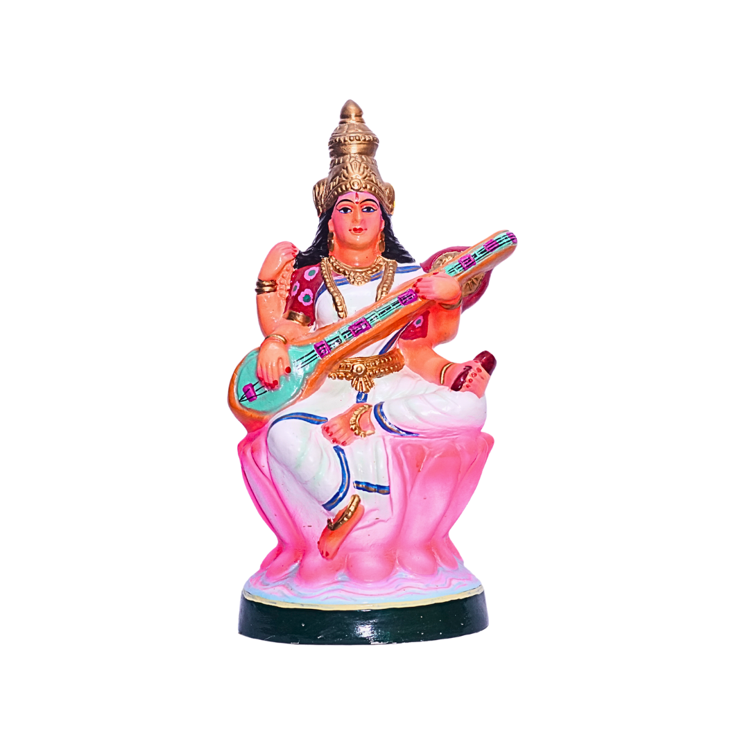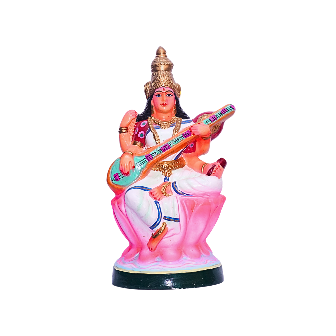 - Design: The statue depicts Goddess Saraswathi seated on a lotus, gracefully holding a veena, a symbol of knowledge and music. Her serene expression and delicate attire showcase the divine attributes of wisdom and creativity. The intricate hand-painted details highlight the goddess’s divine form and add a vibrant touch to the statue.