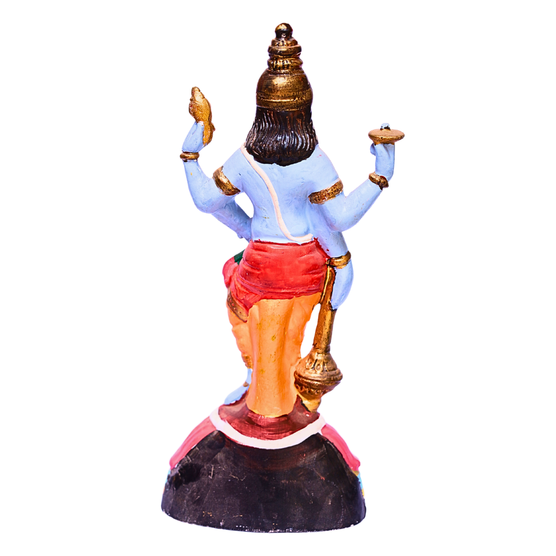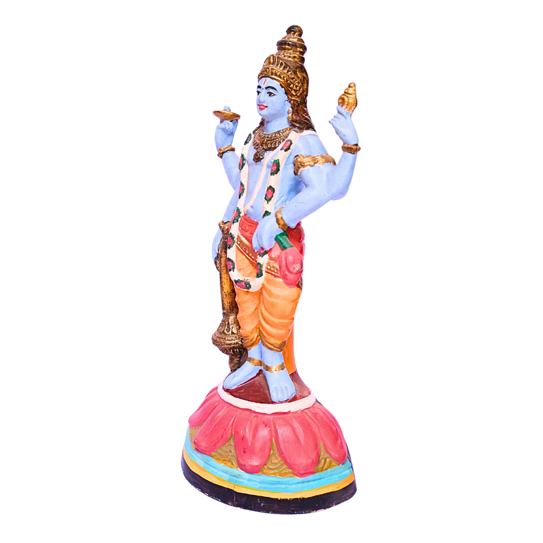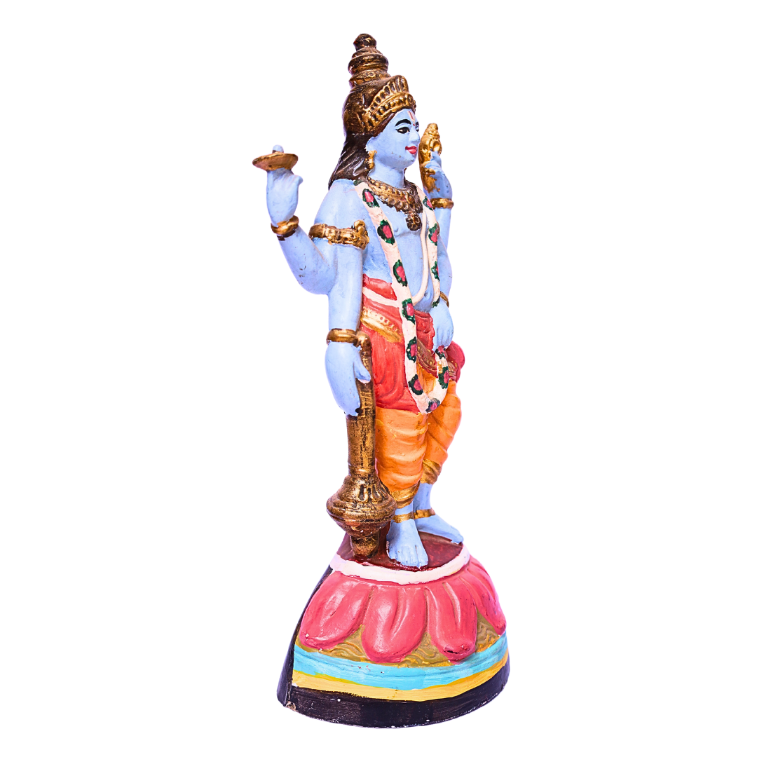 - Intricate Craftsmanship: Hand-painted with incredible attention to detail, Lord Vishnu is depicted with his four arms holding the Shankha (conch), Chakra (discus), Gada (mace), and Padma (lotus). His posture and divine expression convey peace, strength, and protection. The statue also includes delicate details of his attire, jewelry, and crown, highlighting his majestic and serene nature.