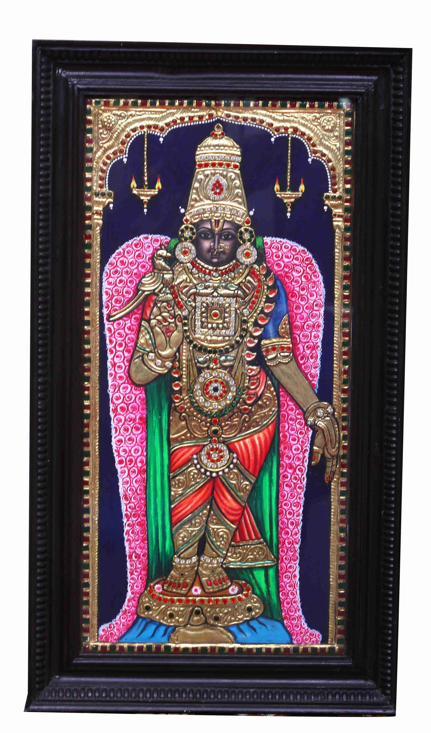 Crafted using the classical Tanjore painting technique that originated in Tamil Nadu, the painting features vibrant colors, rich surface textures, and intricate 22-karat gold foil embellishments. Set against a deep background, the deity’s divine features, adorned jewels, and expressive eyes are brought to life with painstaking detail, evoking spiritual warmth and artistic grandeur.