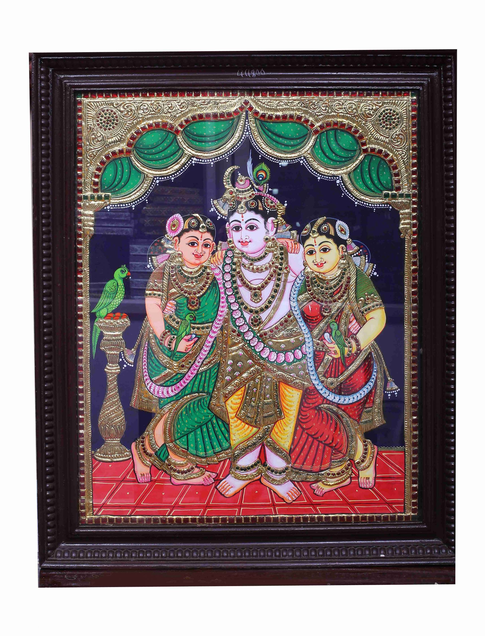Crafted on a wooden board with natural pigments and vegetable dyes, every brushstroke showcases the spiritual depth and ornamental richness that define Tanjore art. The painting comes securely mounted in a premium teakwood frame with glass protection, ready to adorn your walls and captivate hearts.