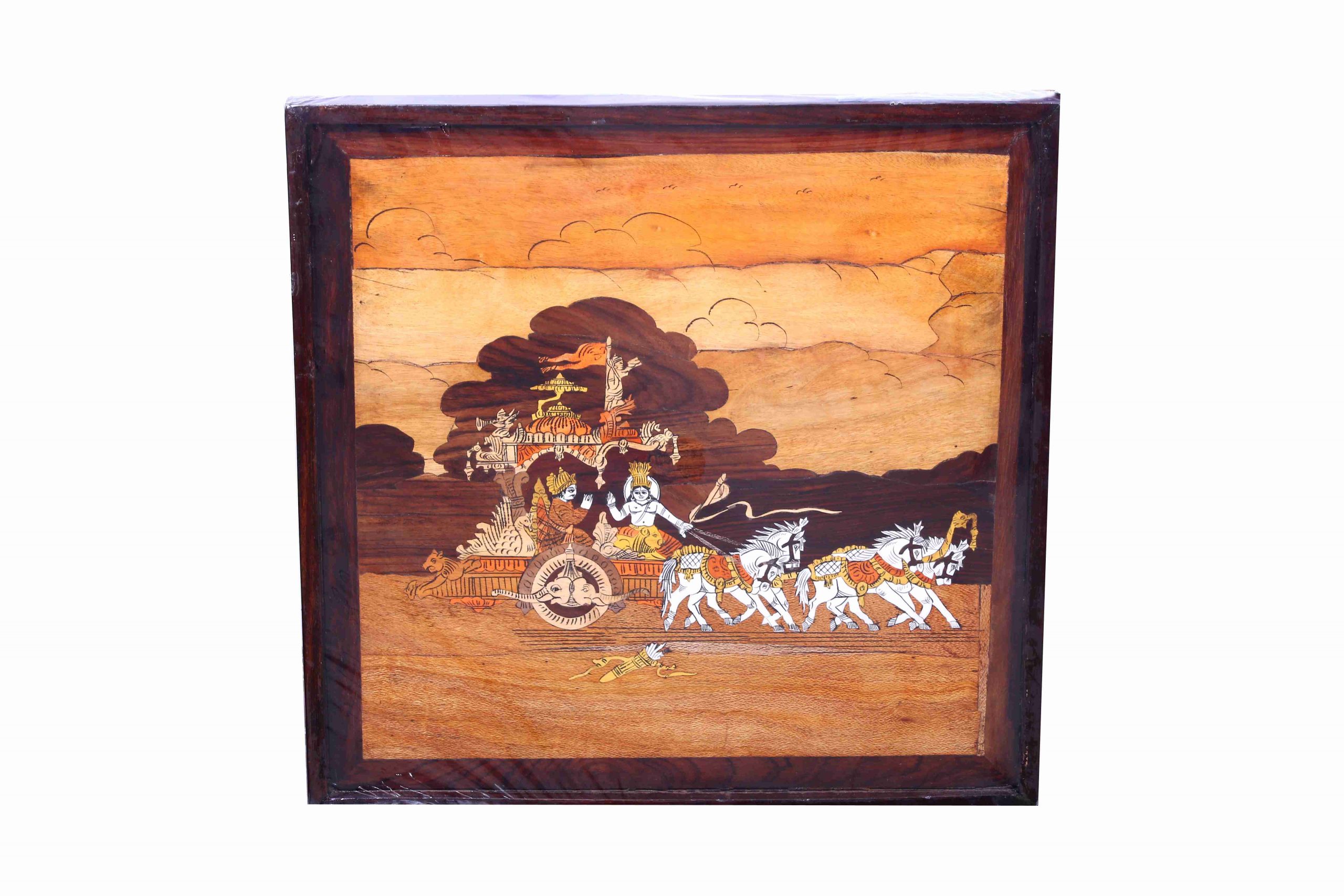 Bring home the divine moment of wisdom and spirituality with this Wood Painting – Geetha Upadesam panel. Handcrafted by skilled artisans, this wooden wall décor depicts the iconic scene of Lord Krishna imparting the sacred Bhagavad Geetha to Arjuna on the battlefield of Kurukshetra. Intricately detailed and painted with rich natural tones, the artwork beautifully captures the expressions, attire, and divine aura of the characters.