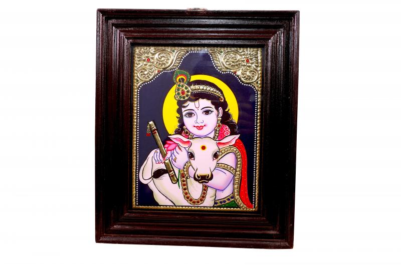 Tanjore Painting of Krishna with Cow – 11 Inches