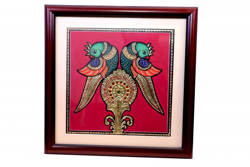 - Design: This artwork depicts Goddess Lakshmi seated gracefully on a blooming lotus, surrounded by a cascade of gold coins symbolizing prosperity. She is portrayed with a serene expression, adorned in beautiful traditional attire and exquisite jewelry. The background features intricate temple motifs and floral patterns that enhance the painting’s spiritual essence. The gold foil work adds a luminous quality, making the piece visually captivating.