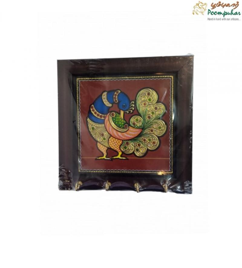 - Design: This artwork features a beautifully detailed peacock, a symbol of beauty and grace in Indian culture, set against an ornate backdrop. The peacock’s vibrant plumage is meticulously crafted, showcasing the artistry of Tanjore painting. The key hanger includes multiple sturdy hooks, perfect for holding keys, bags, or other small items, adding practicality to this decorative piece.