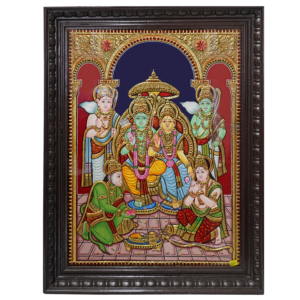 This magnificent Tanjore painting of Perumal beautifully combines traditional craftsmanship with modern aesthetics, creating a captivating focal point that brings spirituality, vibrancy, and charm to your home.