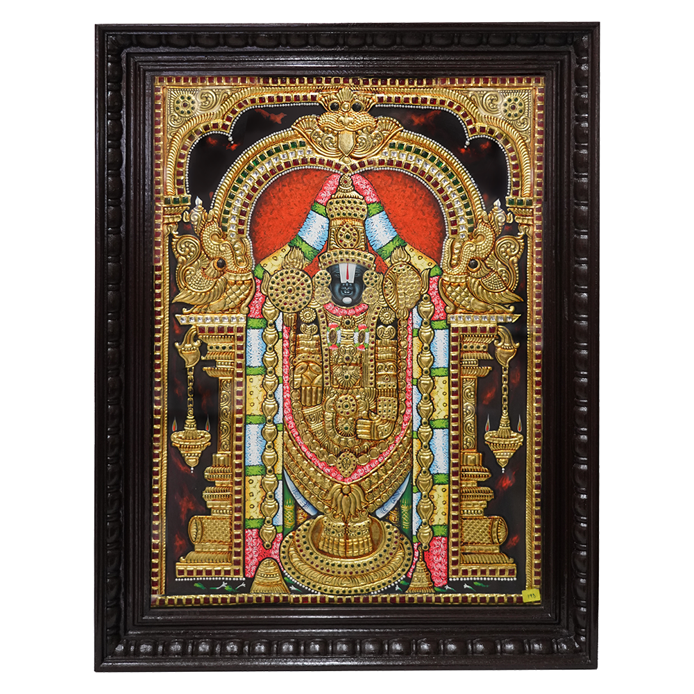 - Artistic Details: Hand-painted by skilled artisans, showcasing intricate details in Perumal’s features, attire, and the surrounding elements, embellished with 22K gold leaf for a luxurious shimmer that brings the artwork to life