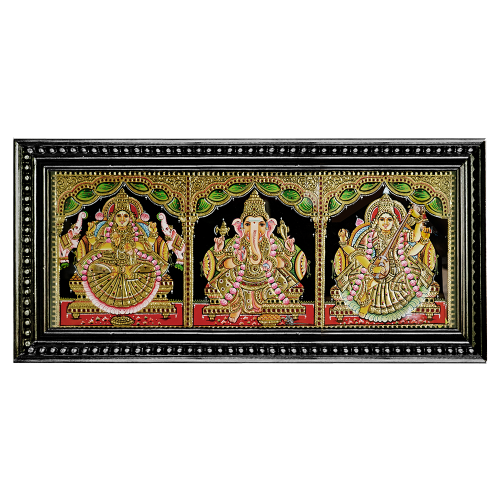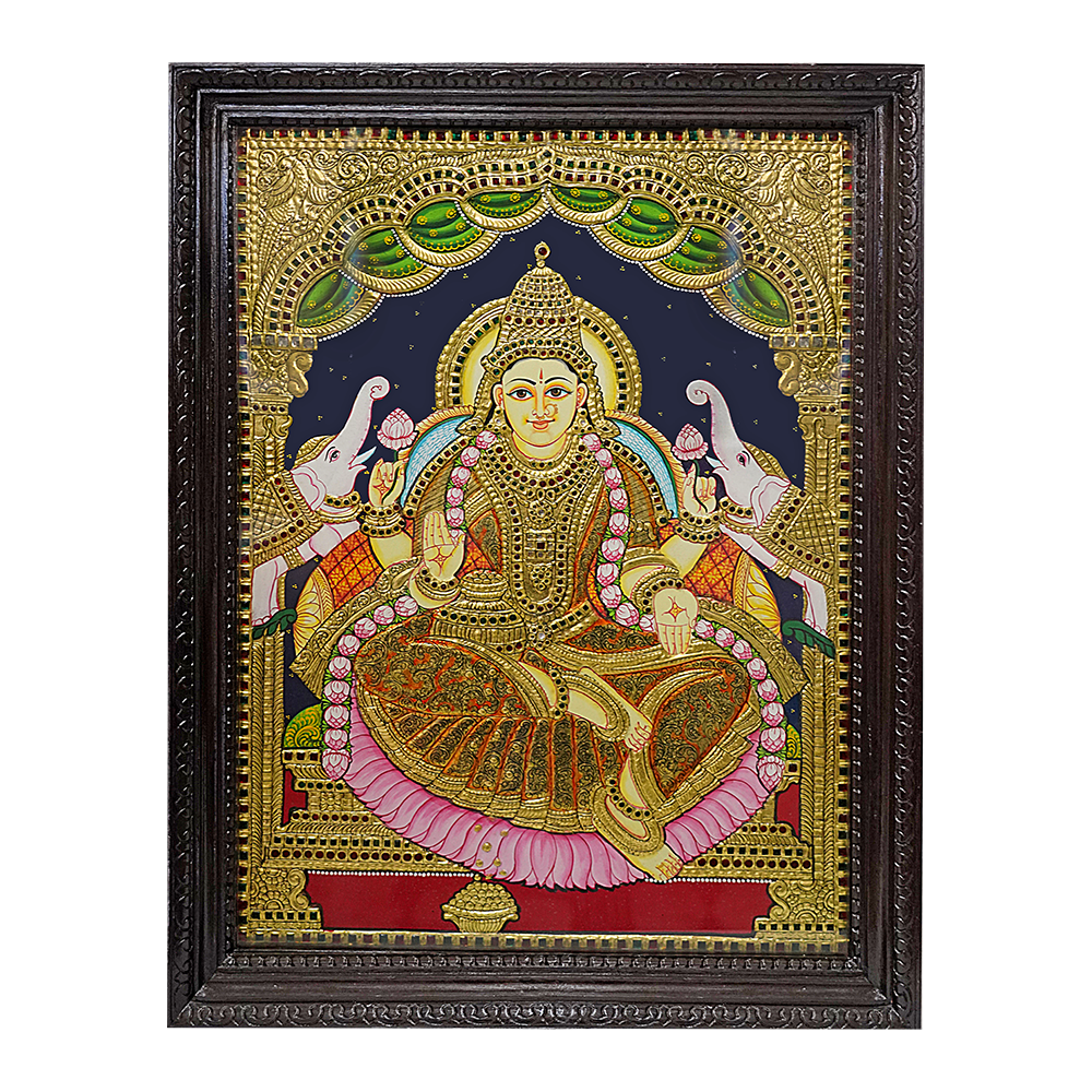 This magnificent Tanjore painting of Perumal Thayaar beautifully combines traditional craftsmanship with modern aesthetics, creating a captivating focal point that brings spirituality, vibrancy, and charm to your home.
