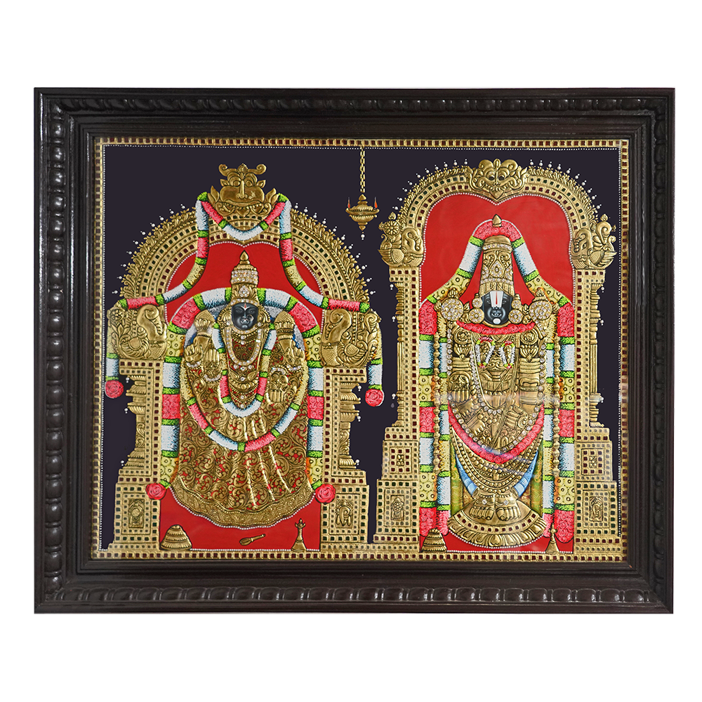 - Color Palette: Rich shades of gold, blue, and green, intricately depicting Perumal and Thayaar in a majestic pose, surrounded by beautifully detailed traditional motifs that enhance the overall elegance and spiritual significance of the piece