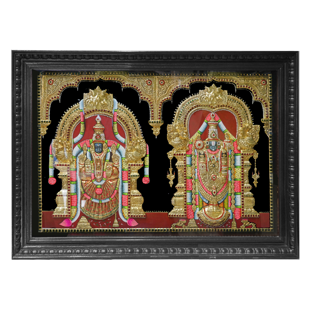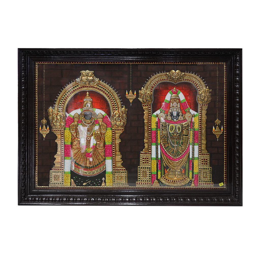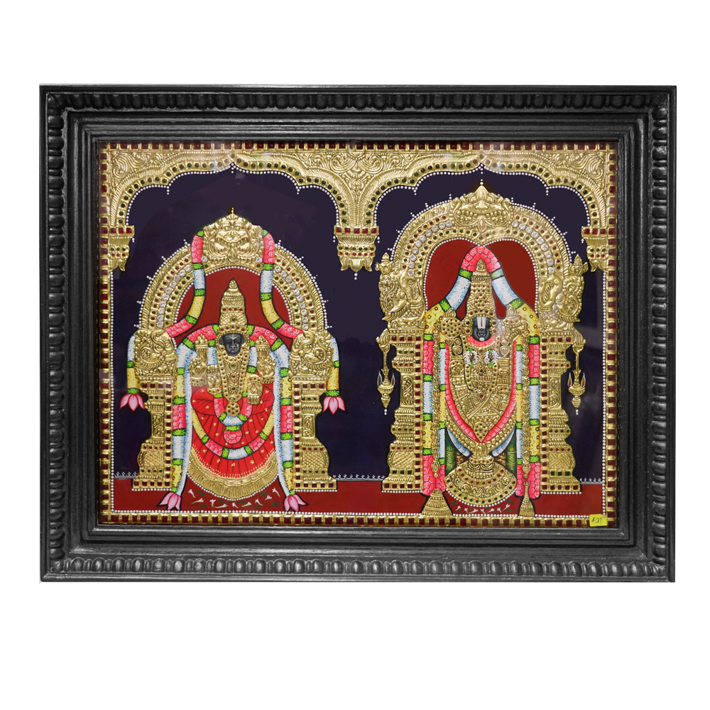 This magnificent 40-inch Tanjore painting depicts Lord Perumal and Goddess Thayaar in an intricately designed temple setting, symbolizing divine blessings and prosperity. Handcrafted by skilled artisans, the painting showcases the vibrant use of traditional colors and the rich texture of gold leaf work, hallmark features of authentic Tanjore art.