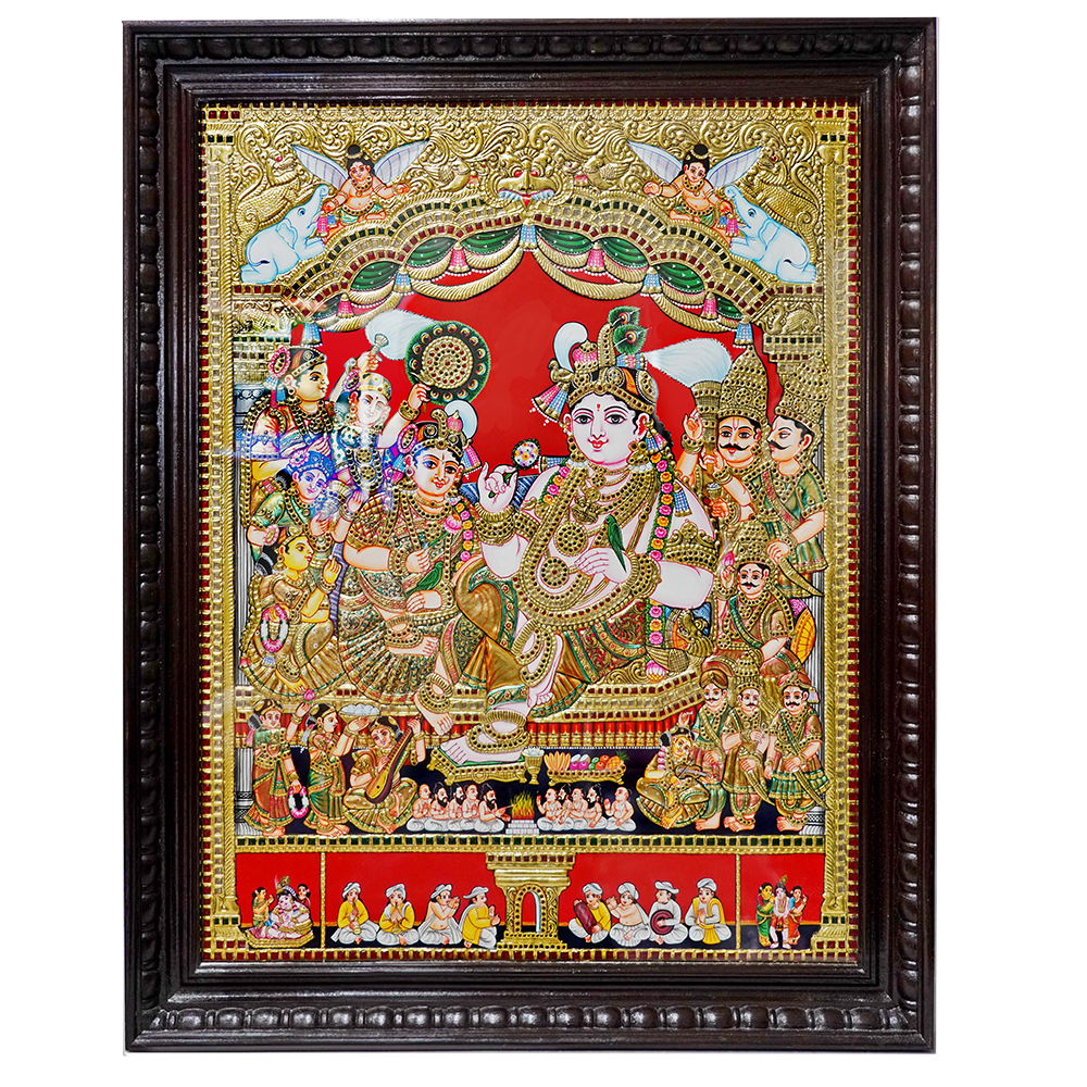 This exquisite 39-inch Tanjore painting of Lord Perumal and Goddess Thayaar radiates divine grace and spiritual energy. A masterful blend of vibrant colors and meticulous gold foil work, this artwork showcases the traditional beauty and grandeur of Tanjore paintings. The deity figures are richly adorned, seated in a temple-style frame, symbolizing protection and prosperity.