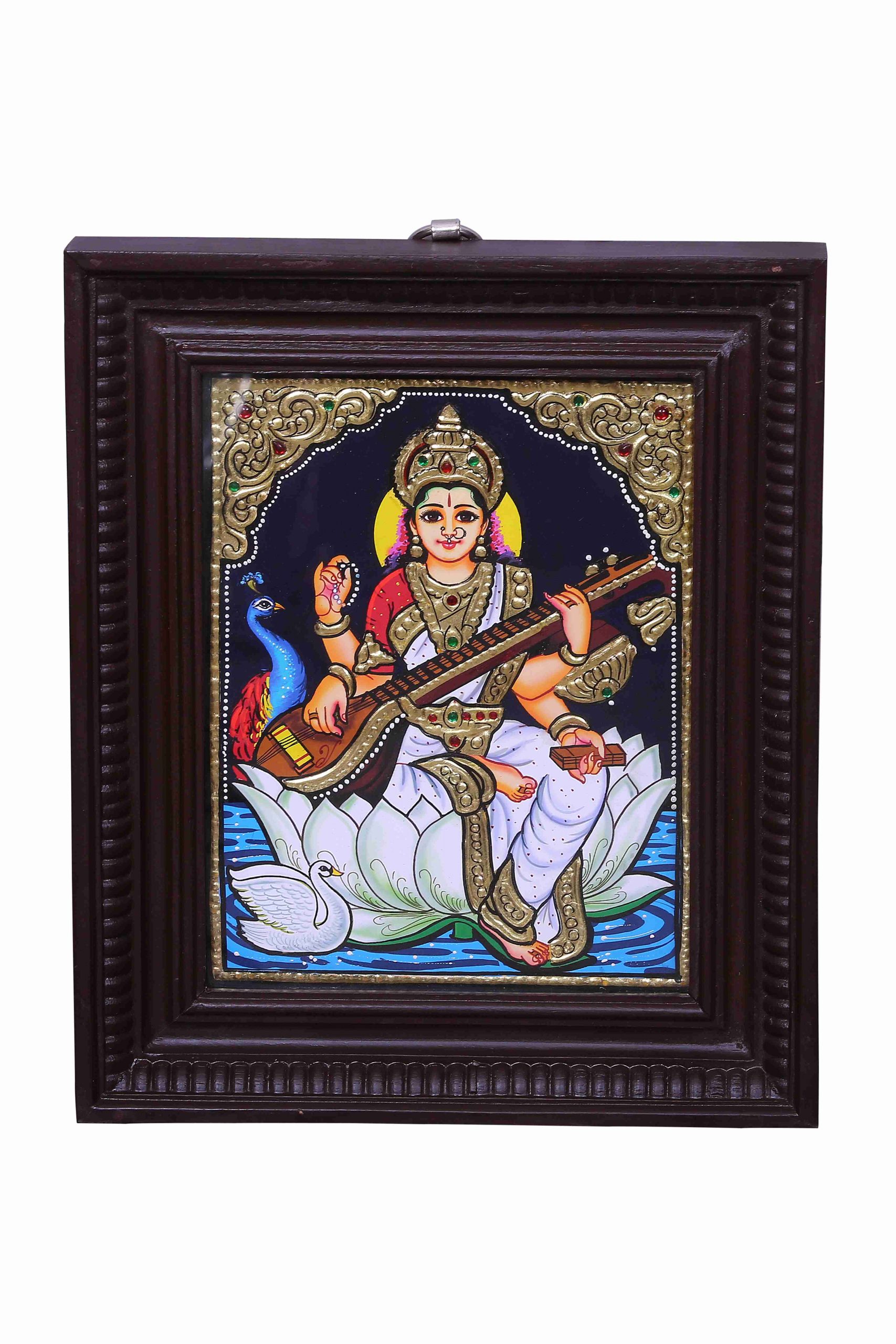 Goddess Saraswathi is depicted with her iconic veena, seated on a lotus, symbolizing purity, knowledge, and creativity. This exquisite artwork enhances the ambiance of your pooja room, study area, or living space, offering both spiritual significance and aesthetic charm.