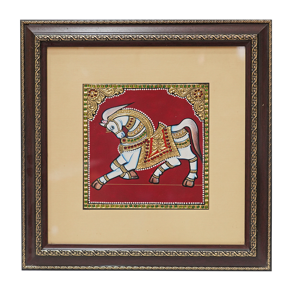 This exquisite Tanjore painting of a white horse elegantly combines traditional craftsmanship with contemporary design, creating a captivating focal point that adds charm and beauty to your home.
