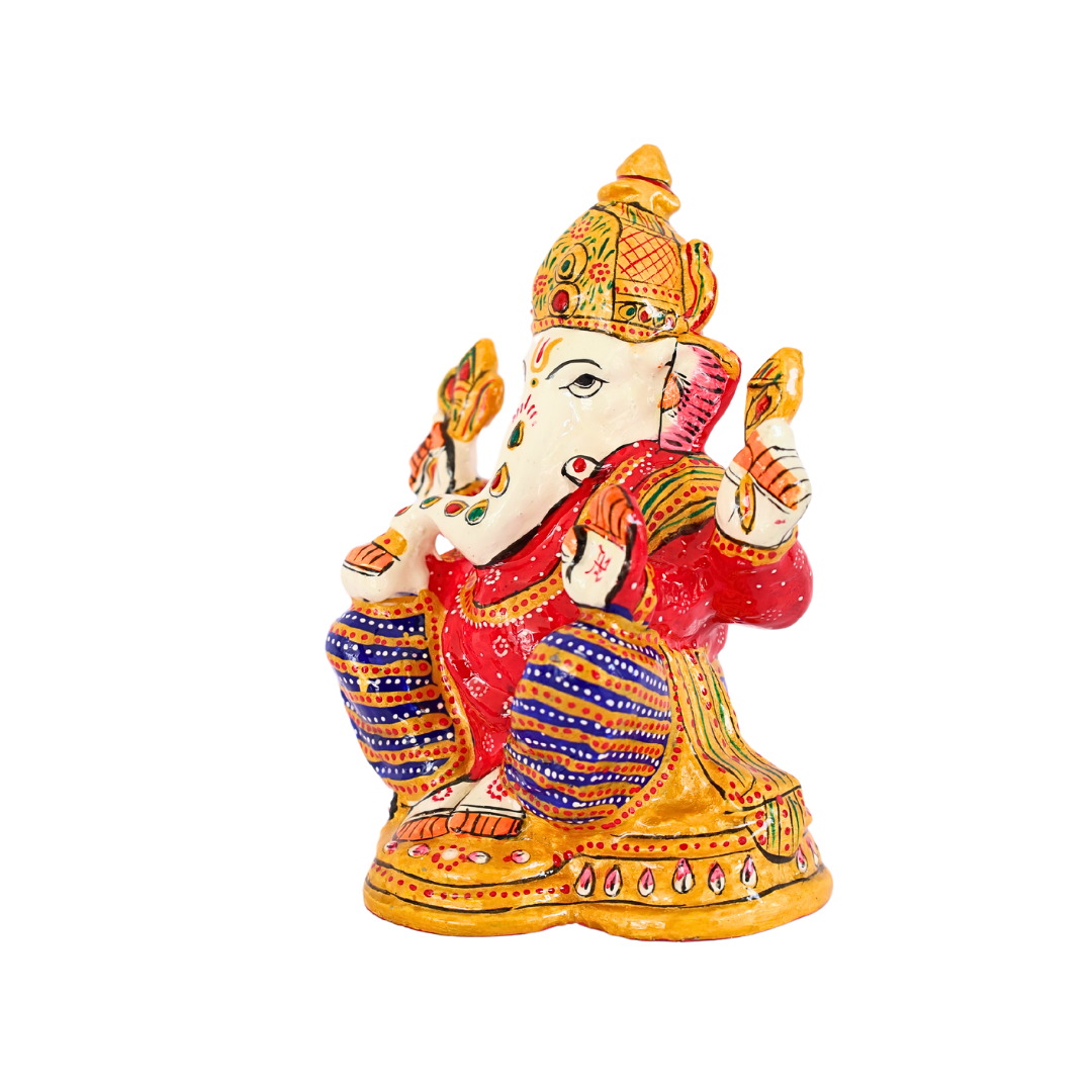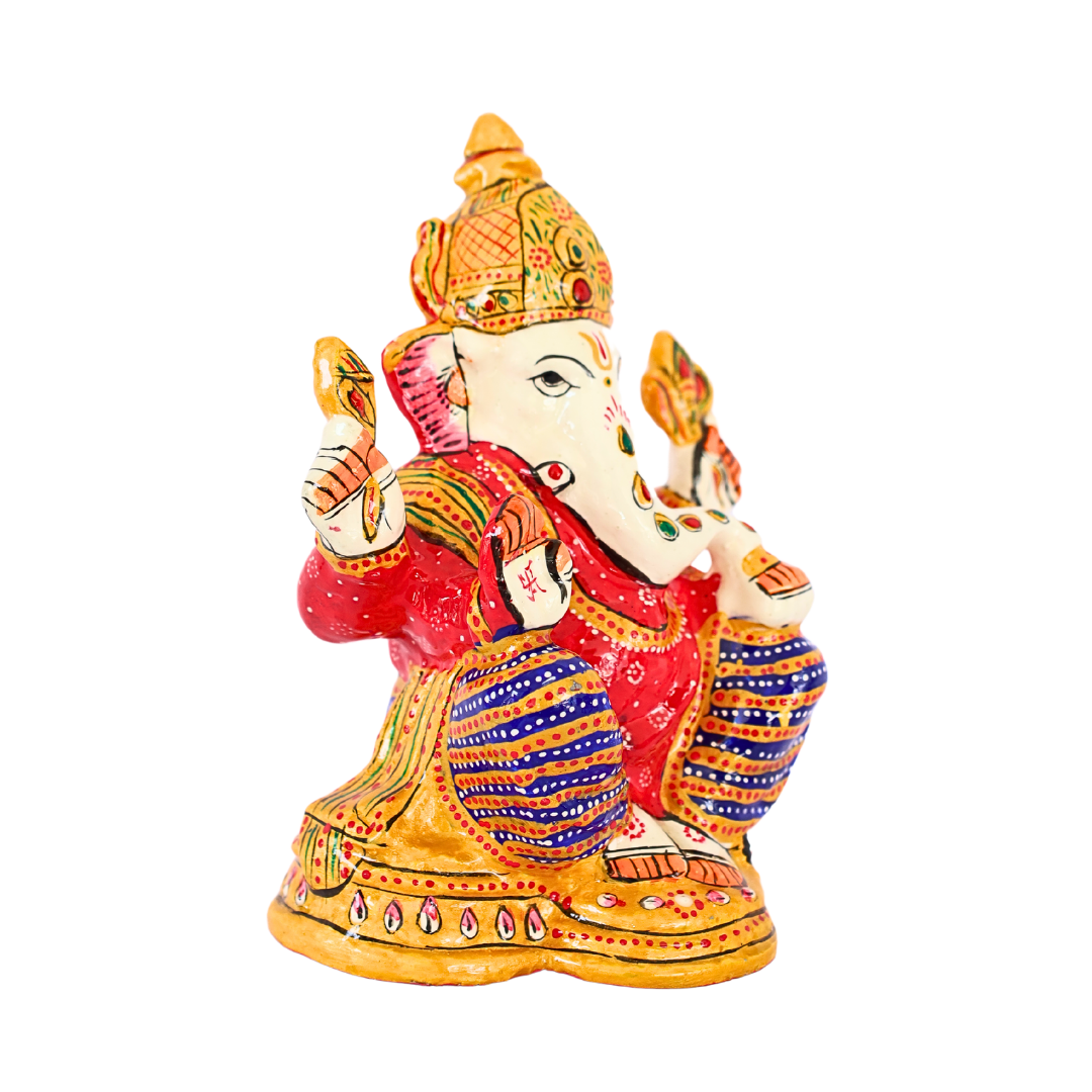 - Design: The statue is intricately sculpted, showcasing Lord Ganesha in his traditional seated posture with detailed features, including his elephant head, large ears, and symbolic trunk. His multiple arms hold traditional items such as a modak (sweet), a lotus, and a conch, all imbued with spiritual significance.
