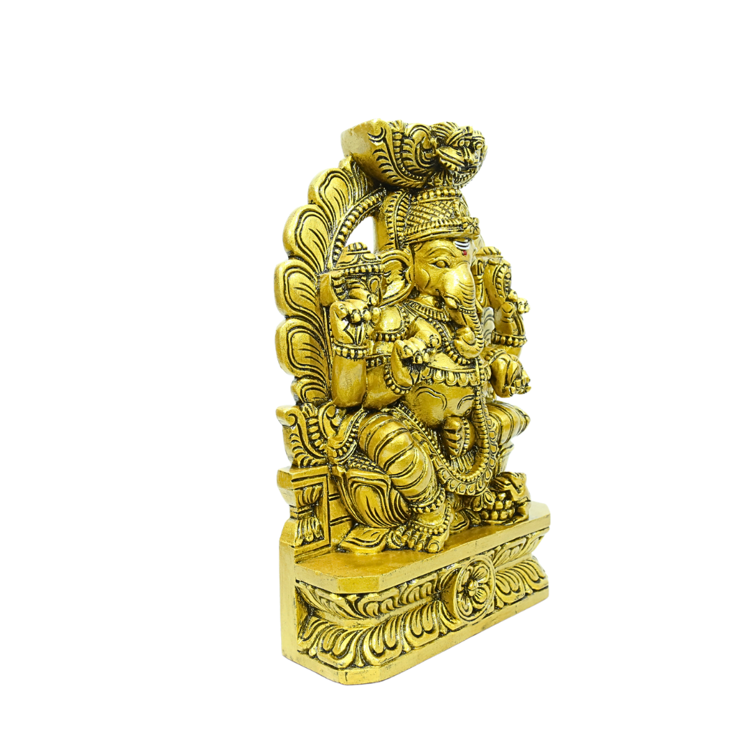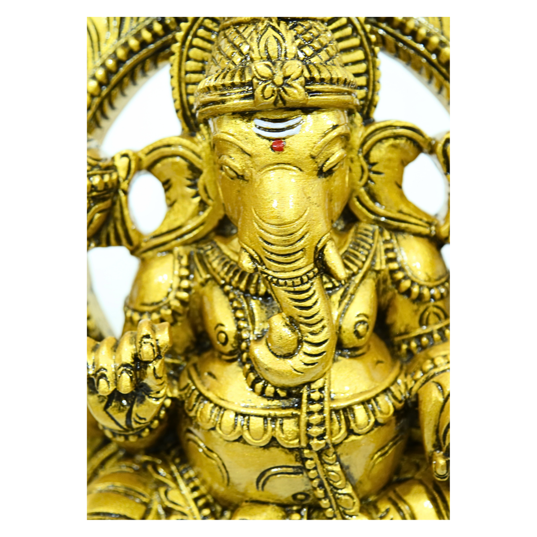 - Design: Traditional hand-carved seated statue of Lord Ganesha, framed within an elegant arch, with a gold antique finish for a vintage and regal appearance.