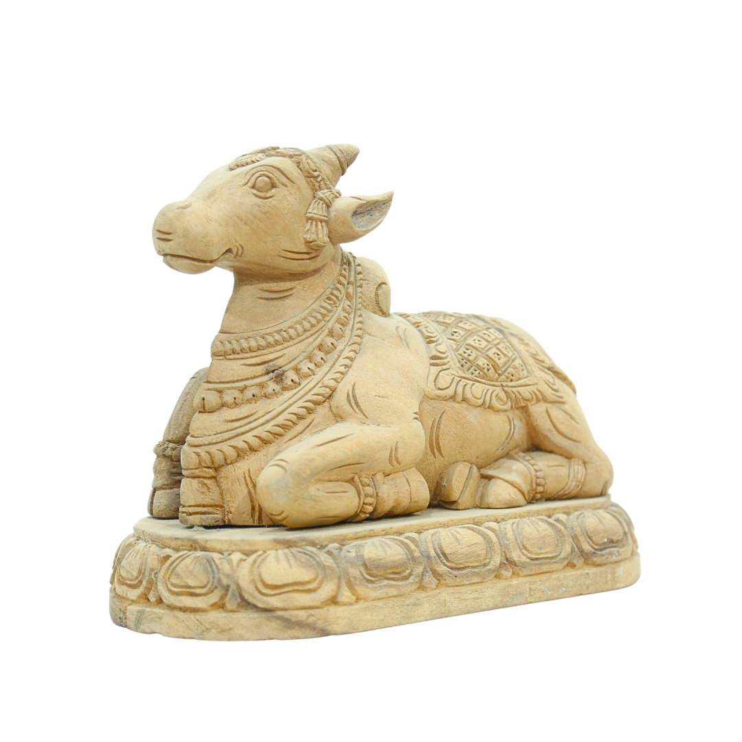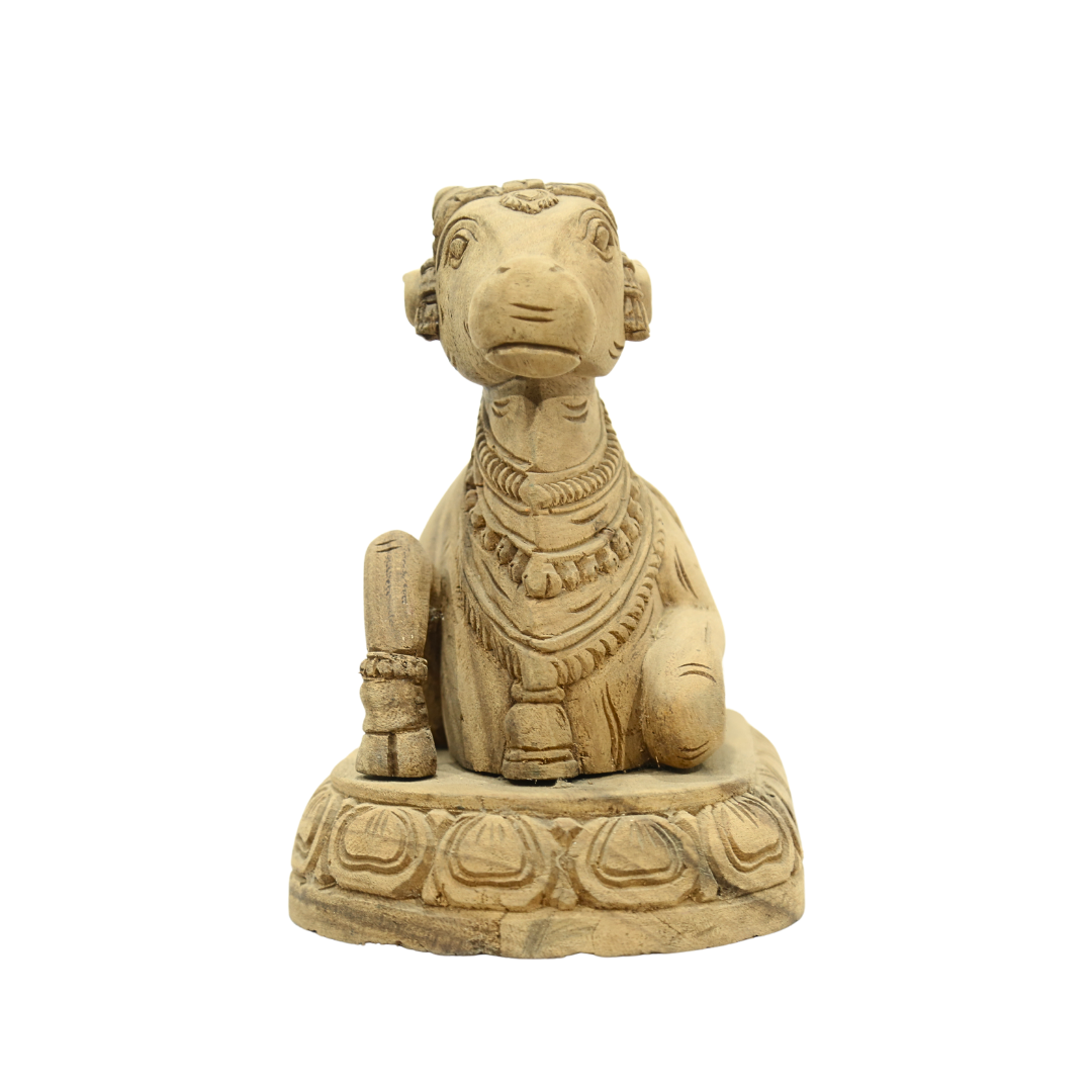 - Handcrafted from Natural Wood: This Wooden Nandhi is made from solid, high-quality wood. The natural, unpolished finish highlights the authentic grain and texture of the wood, giving the statue a rustic, earthy appearance. This unique design celebrates the purity and simplicity of nature.