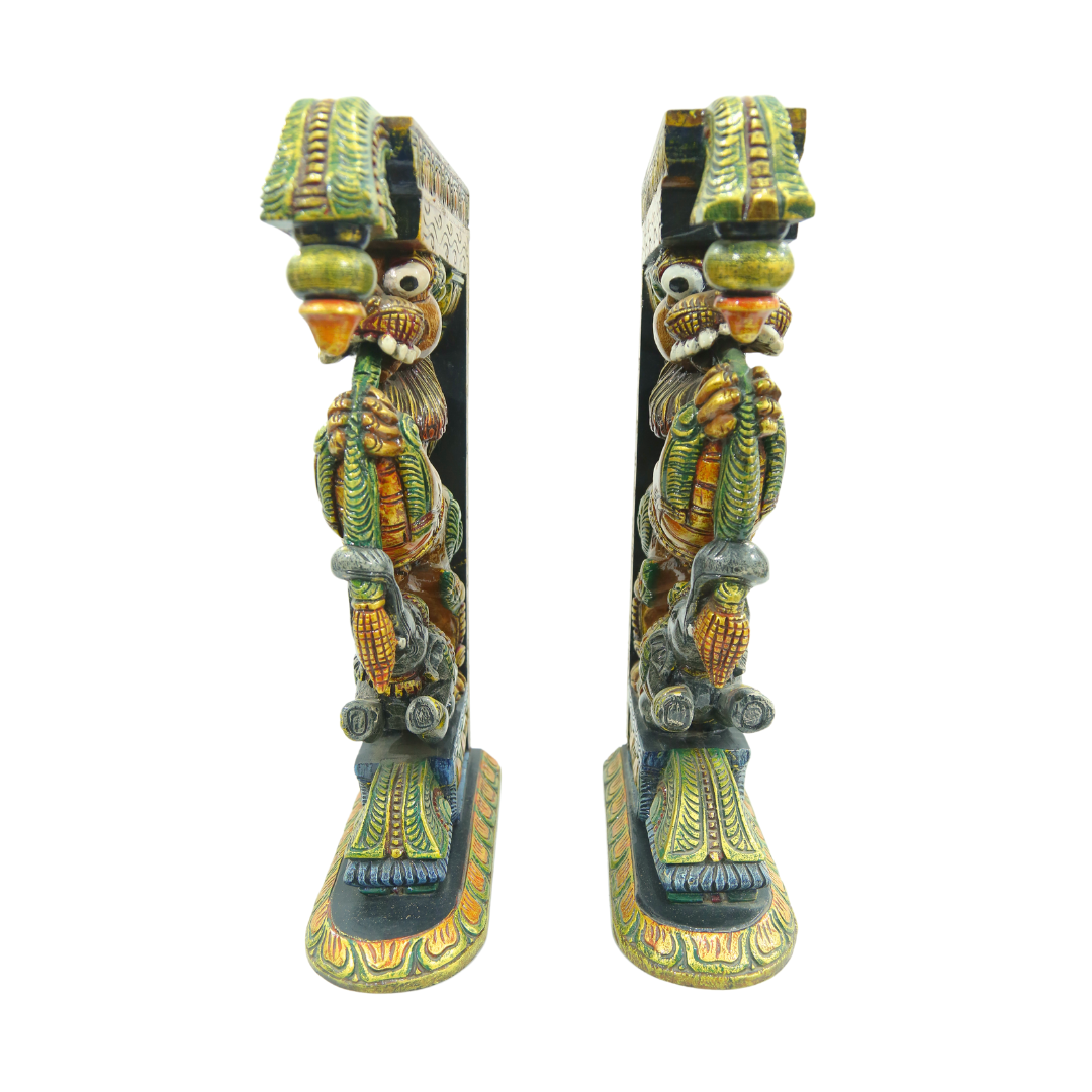 Add a touch of regal elegance and traditional craftsmanship to your home decor with this exquisite Wood Yalli Wall Mount Bracket. Crafted from premium wood, this set of 2 21-inch Yalli wall brackets features intricate detailing and a multicolor antique finish, making them perfect for mounting decorative items, lighting fixtures, or even artwork. The Yalli, a mythical creature from South Indian culture, is elegantly portrayed in each bracket, showcasing the craftsmanship of skilled artisans.